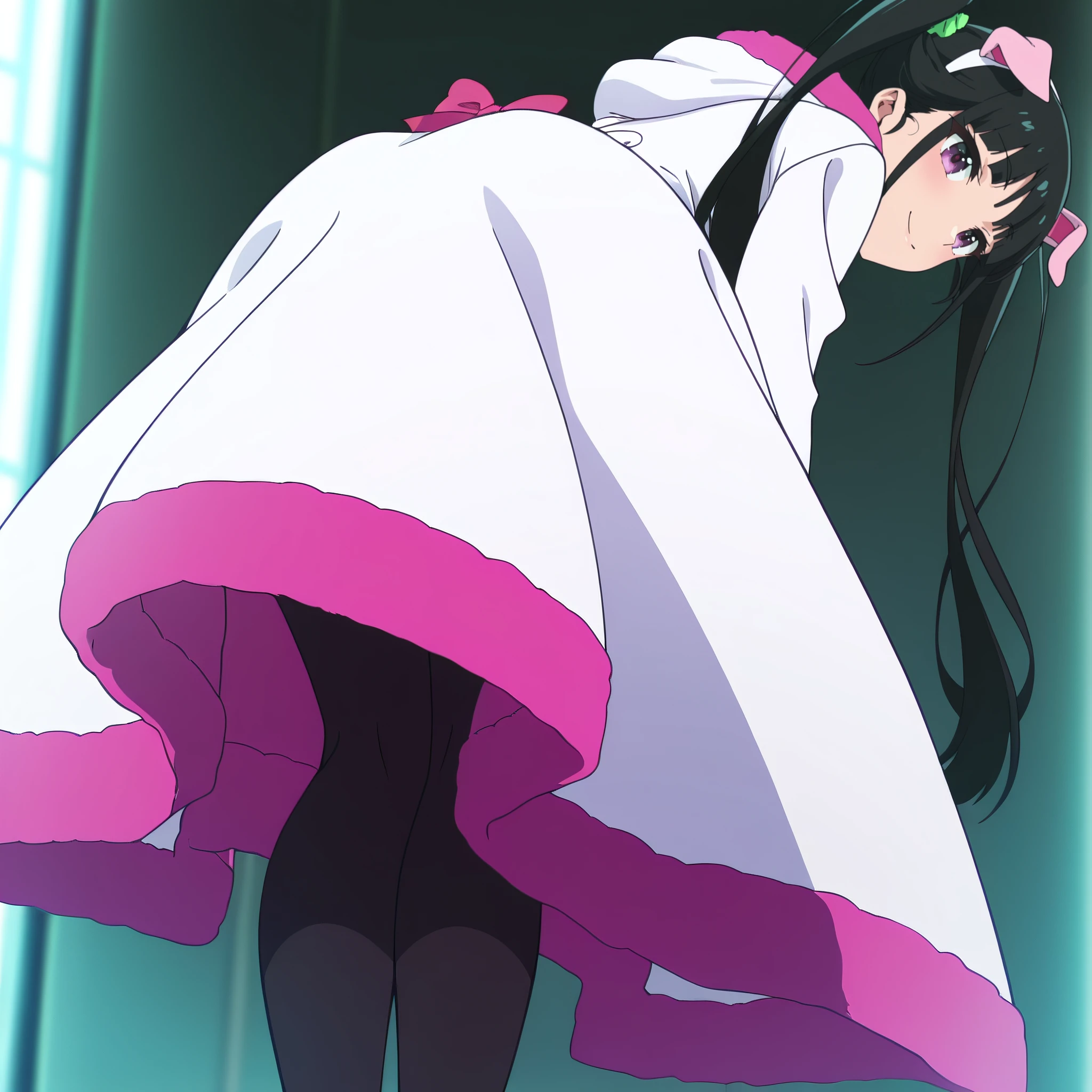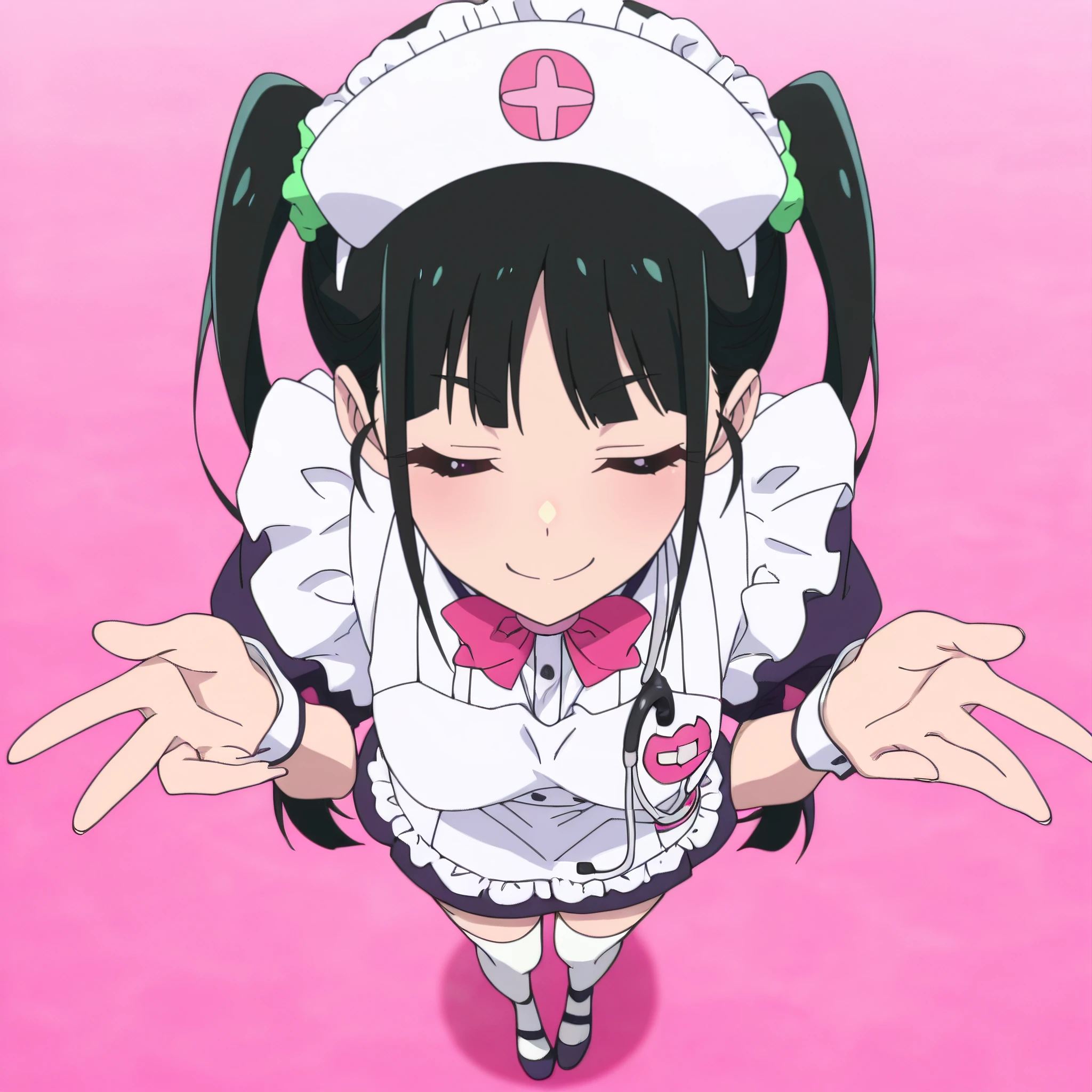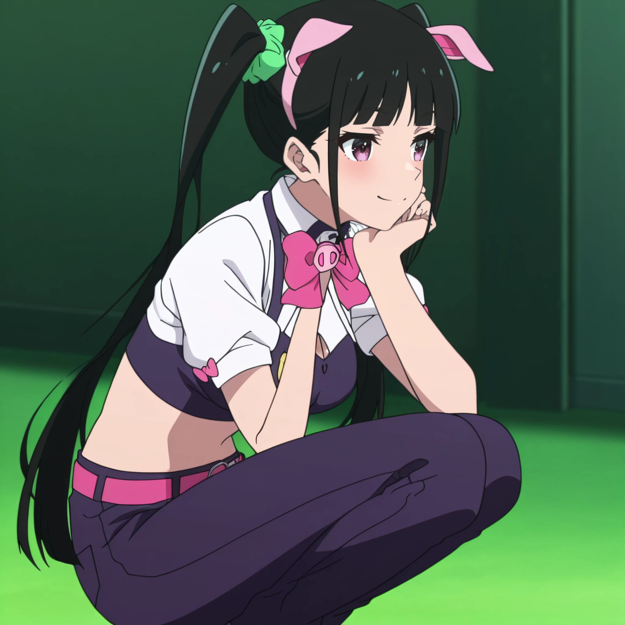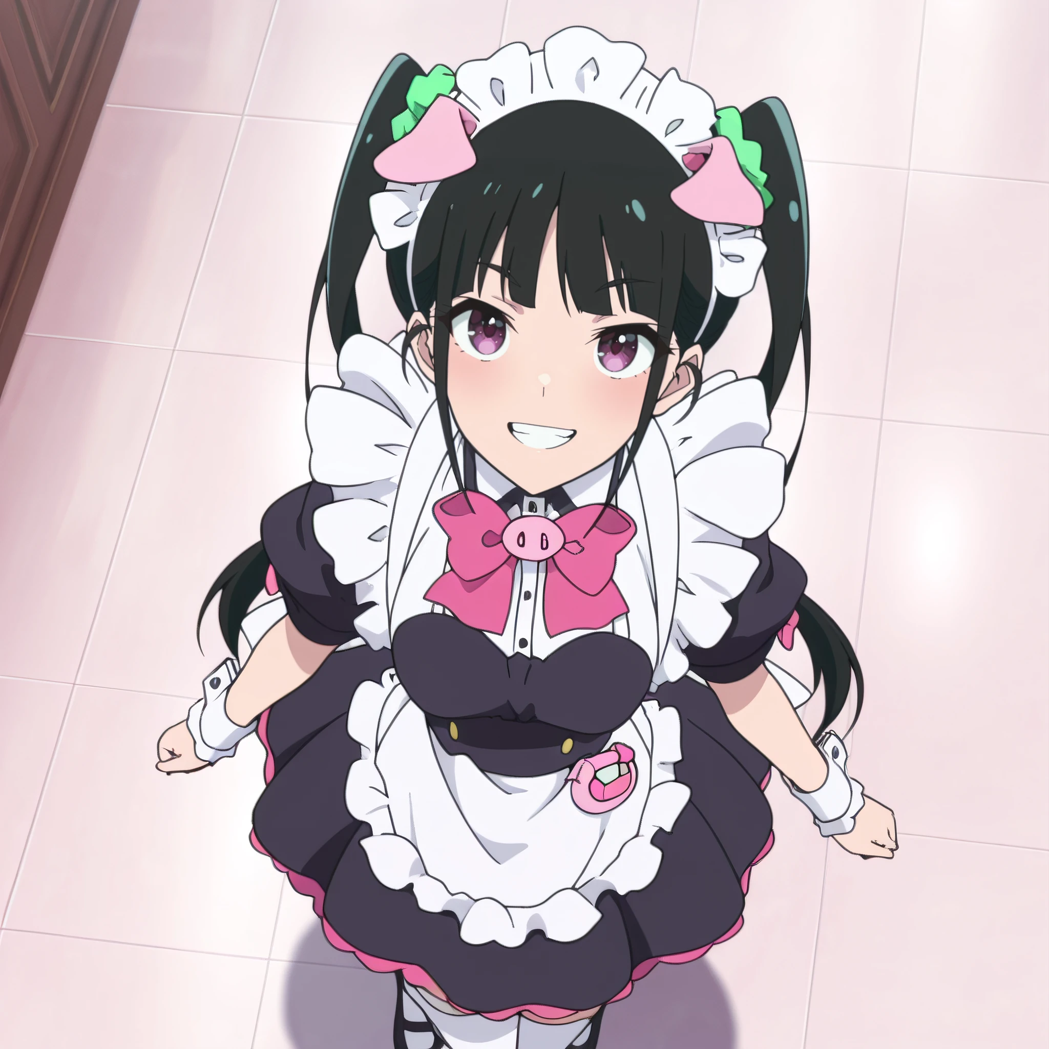 YumechiMaid, maid, maid headdress, apron, maid apron, frills, white apron, pink bow, enmaided, bowtie, wrist cuffs, short sleeves, dress, pink bowtie, hair ornament, hair scrunchie, green scrunchie, pig ears, white thighhighs, black dress, animal ears,