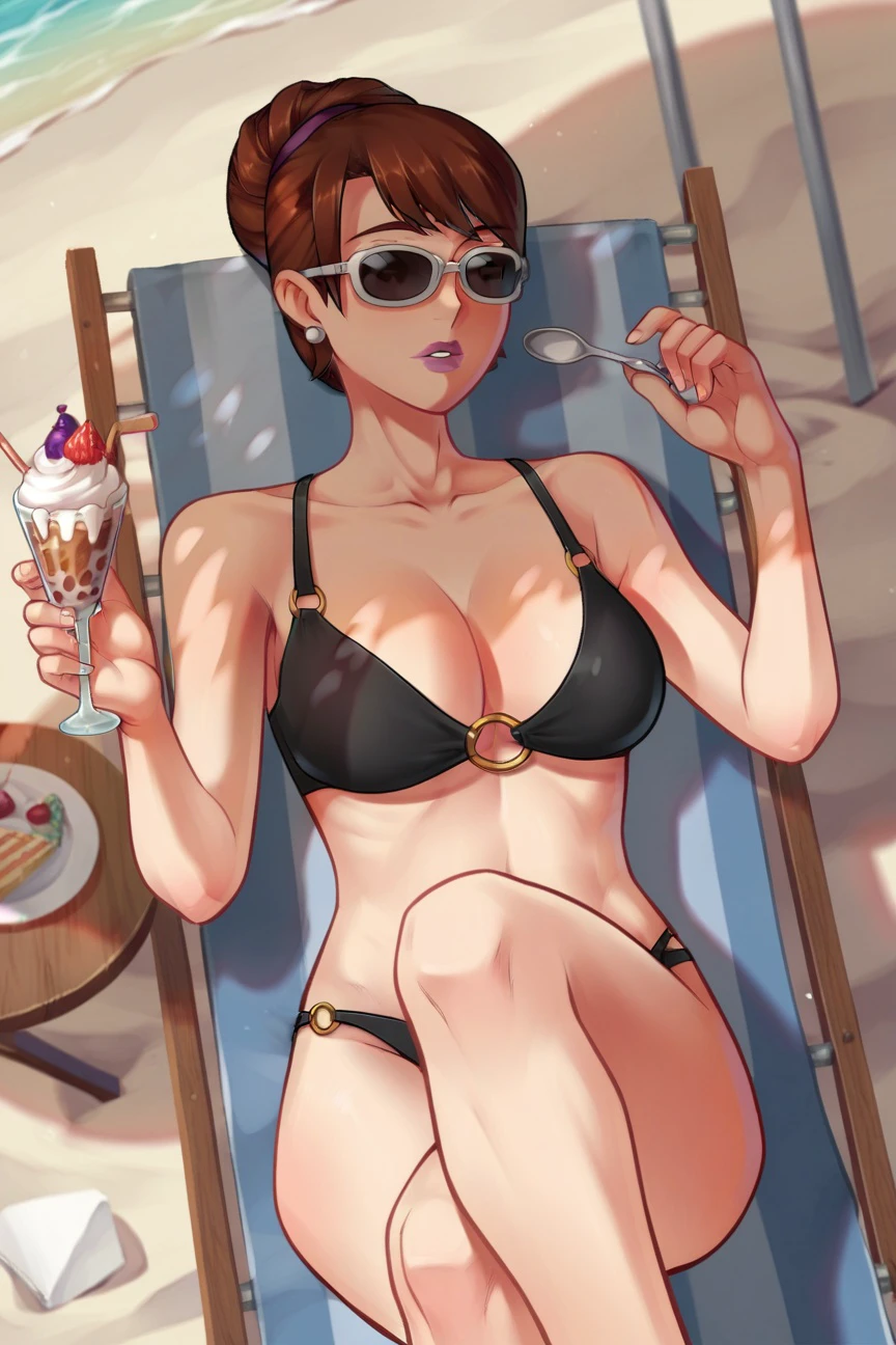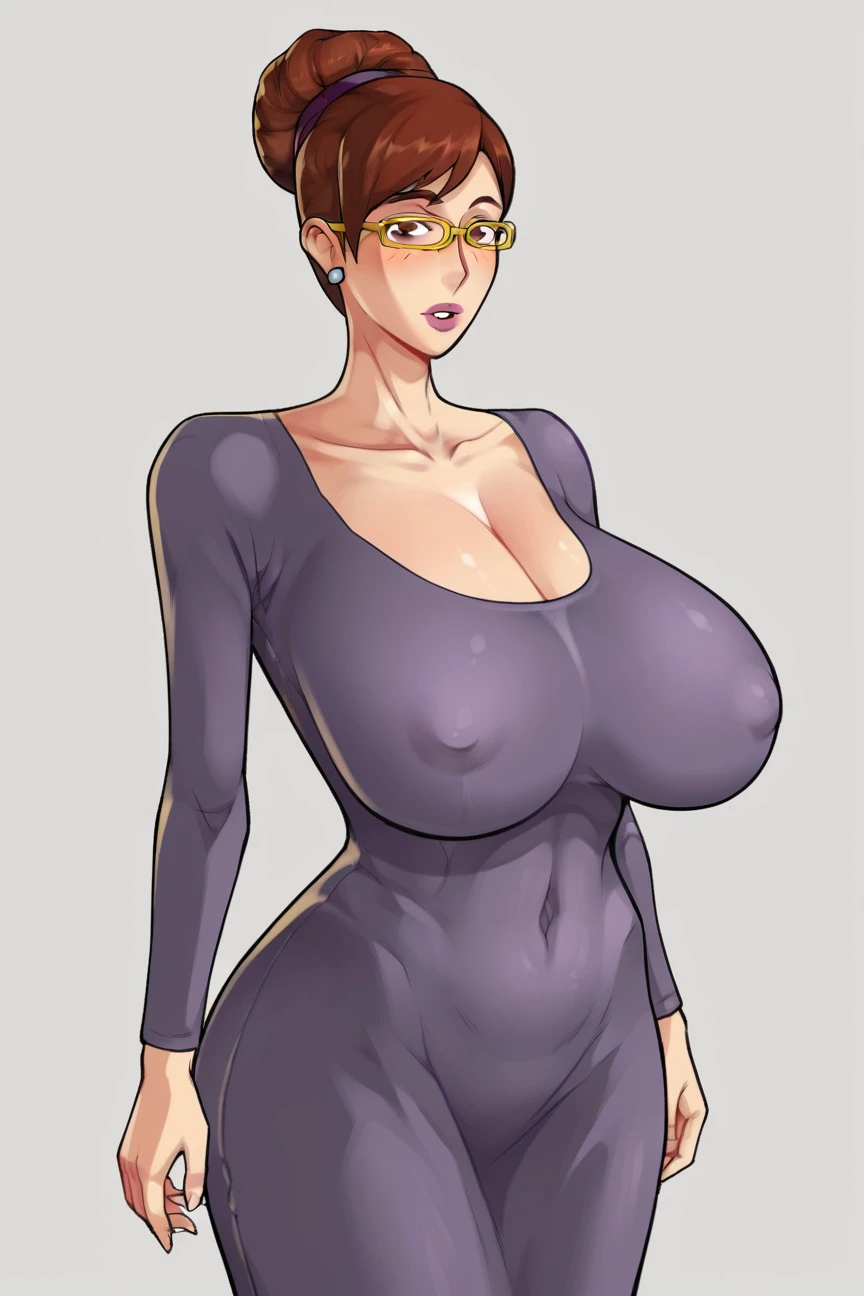 floyd's stepmom /(mnf/), brown hair, updo, single hair bun, purple dress, long dress, long sleeves, cleavage, brown eyes, earrings, glasses, yellow-framed eyewear, covered navel, hair ribbon, purple ribbon, collarbone