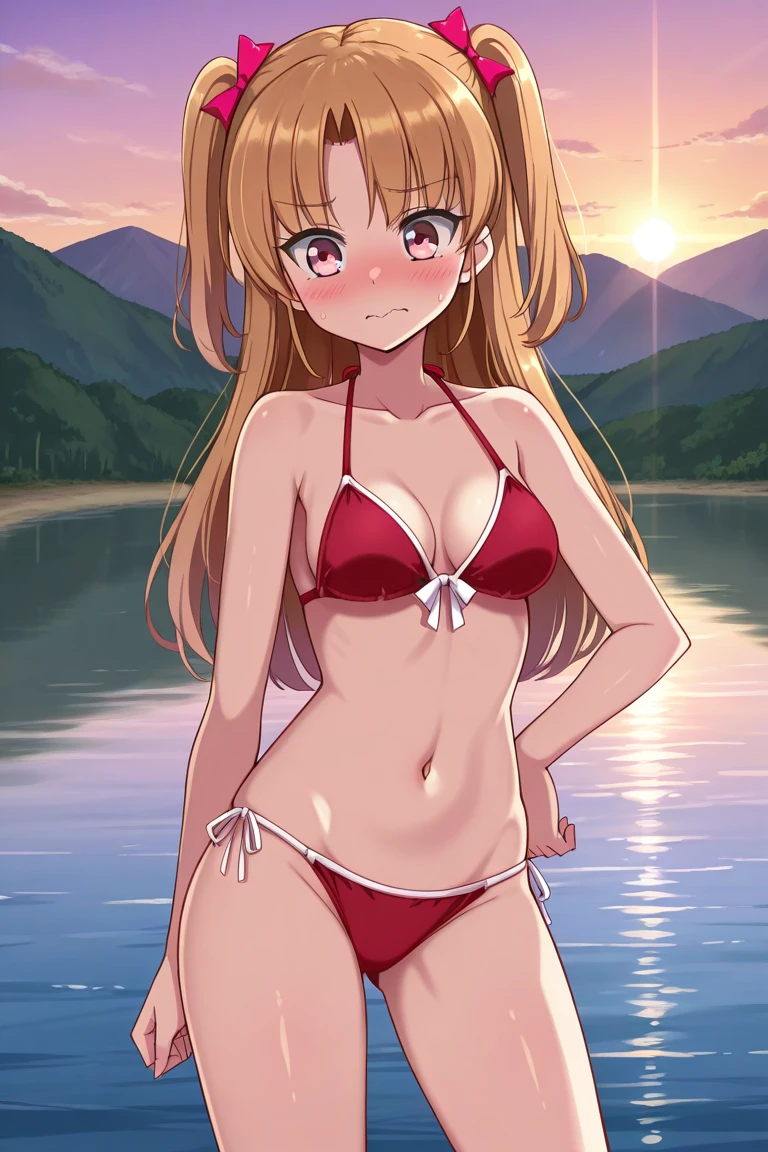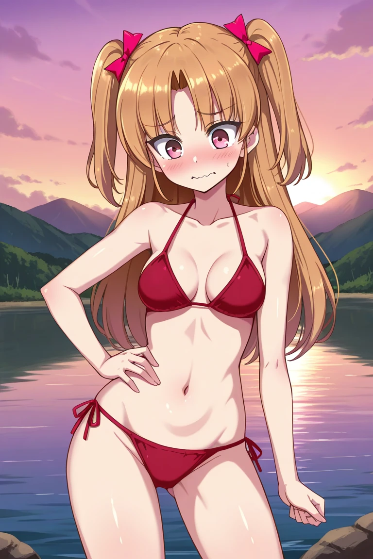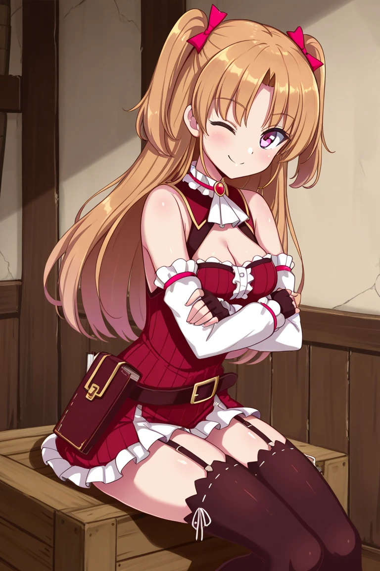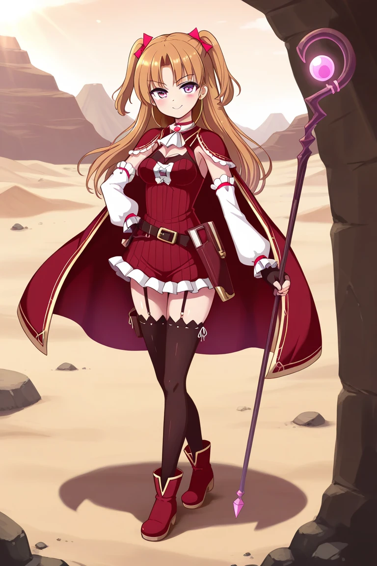 Keywords: lauraabsno, 1girl, solo, brown hair, long hair, two side up, parted bangs, hair bow, pink bow, pink eyes, medium breasts, choker, ascot, red cape, detached sleeves, black gloves, fingerless gloves, red dress, ribbed dress, belt, book holster, garter straps, black thighhighs, ankle boots, red footwear,
