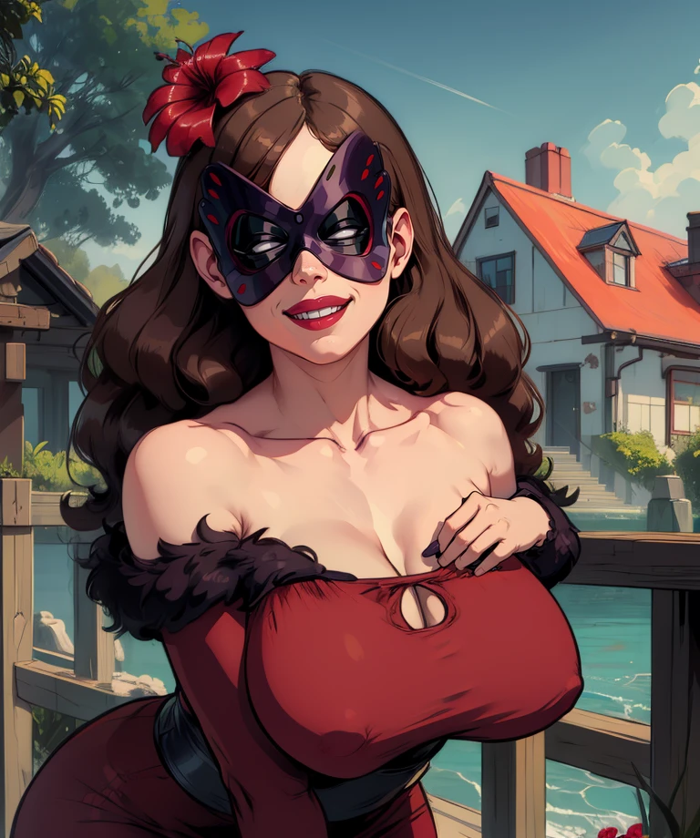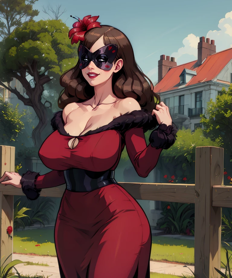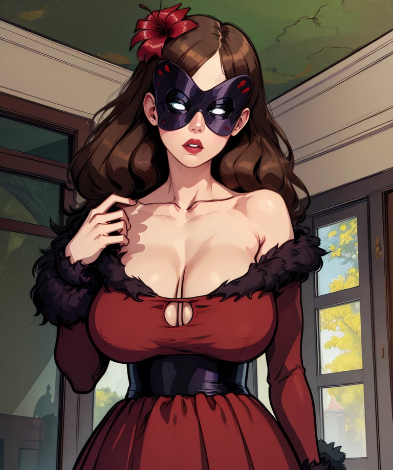 camellia, domino mask, hair flower, brown hair, or grey hair,