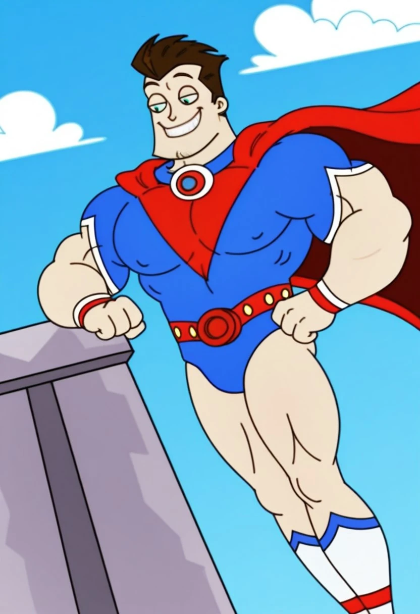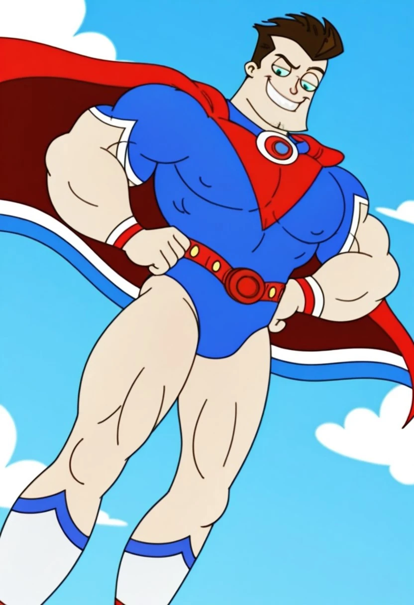 Outfit Prompts: "superhero, blue leotard, cape, socks, belt, wristband"