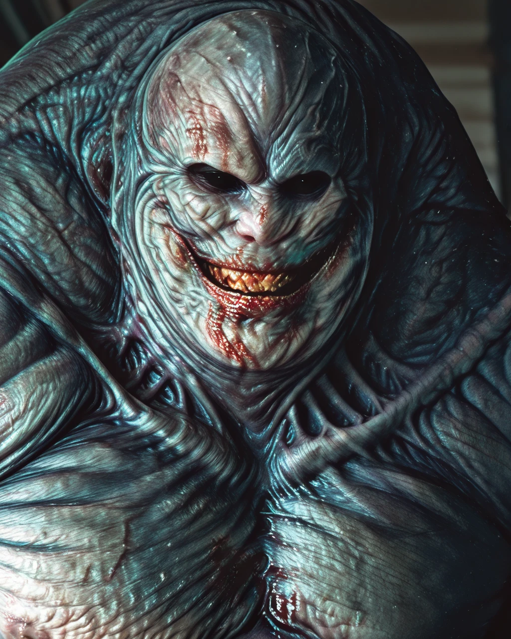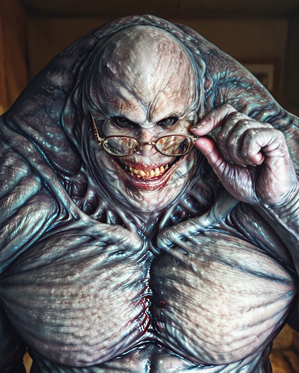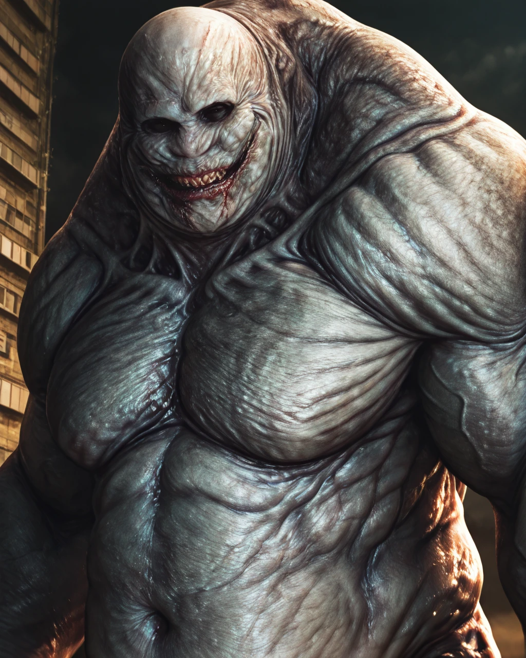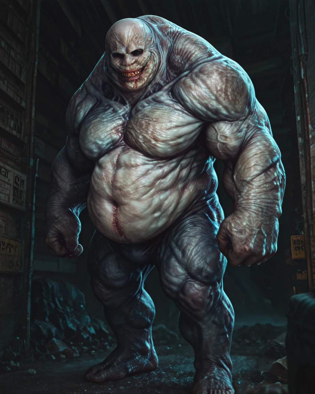 monster, no human, gigantic, grey skin, ugly skin, ugly appearance, protruding belly, deformed body, black eyes, bald, muscular