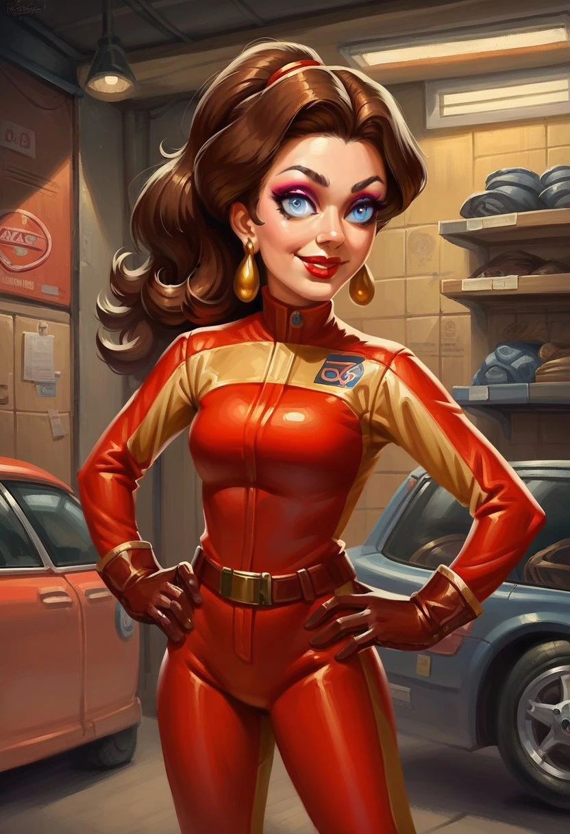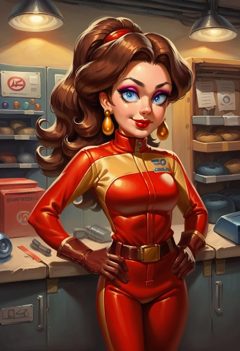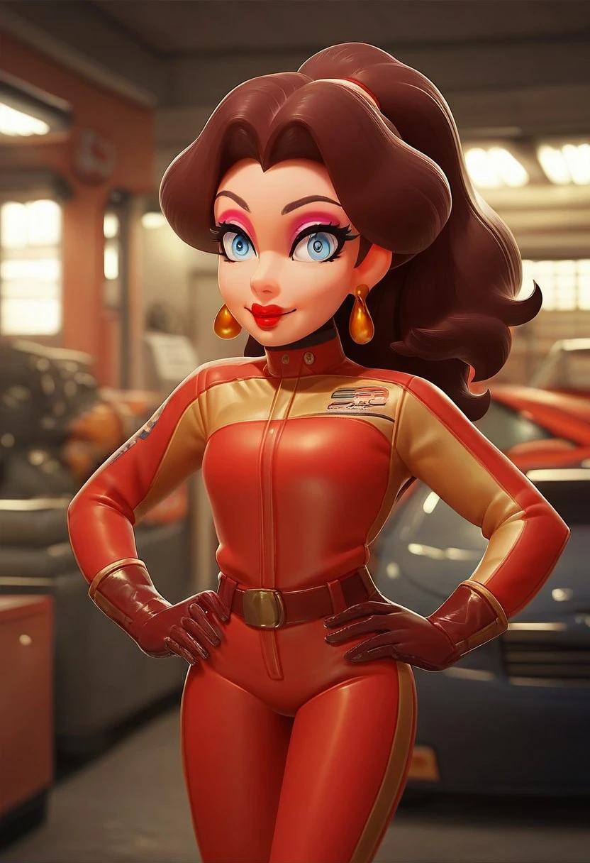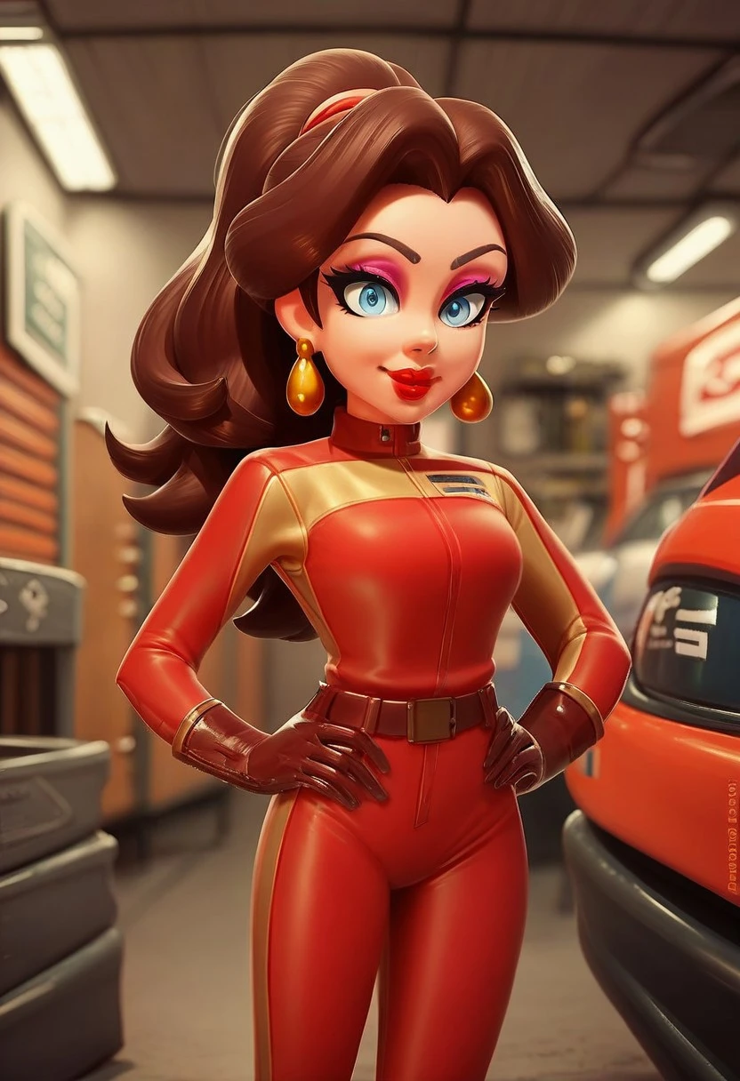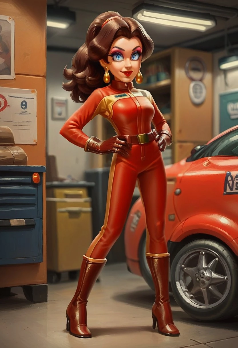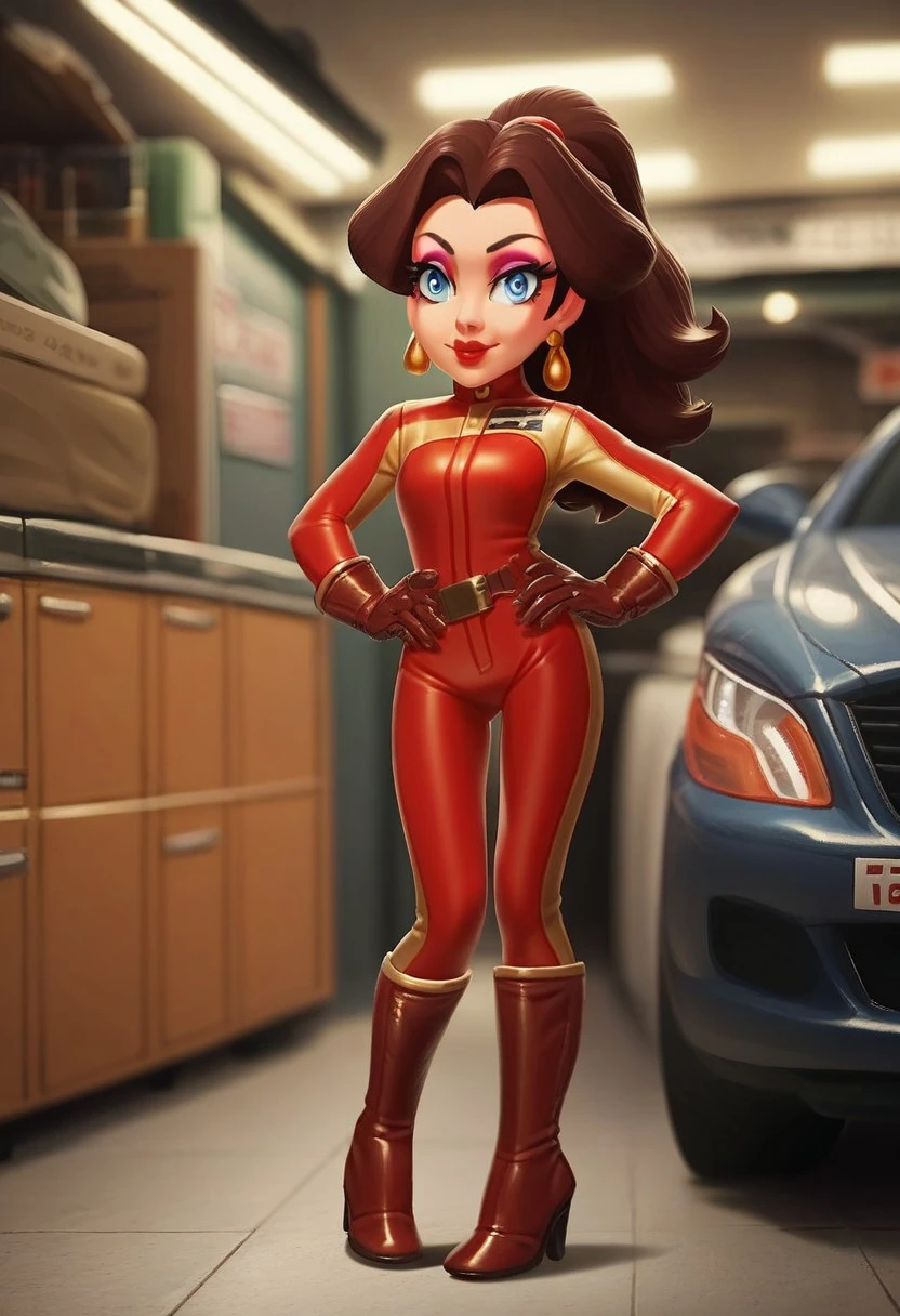 A3ro_Paul1ne, brown hair, long hair, ponytail, blue eyes, eyeshadow, red lips, earrings, bodysuit, red gloves, belt, red high heel boots