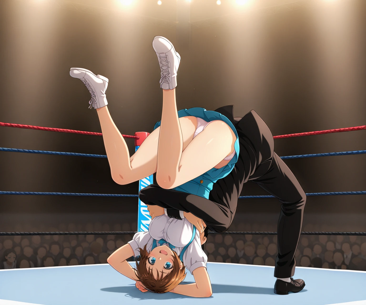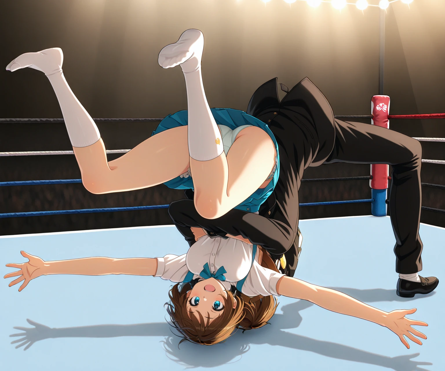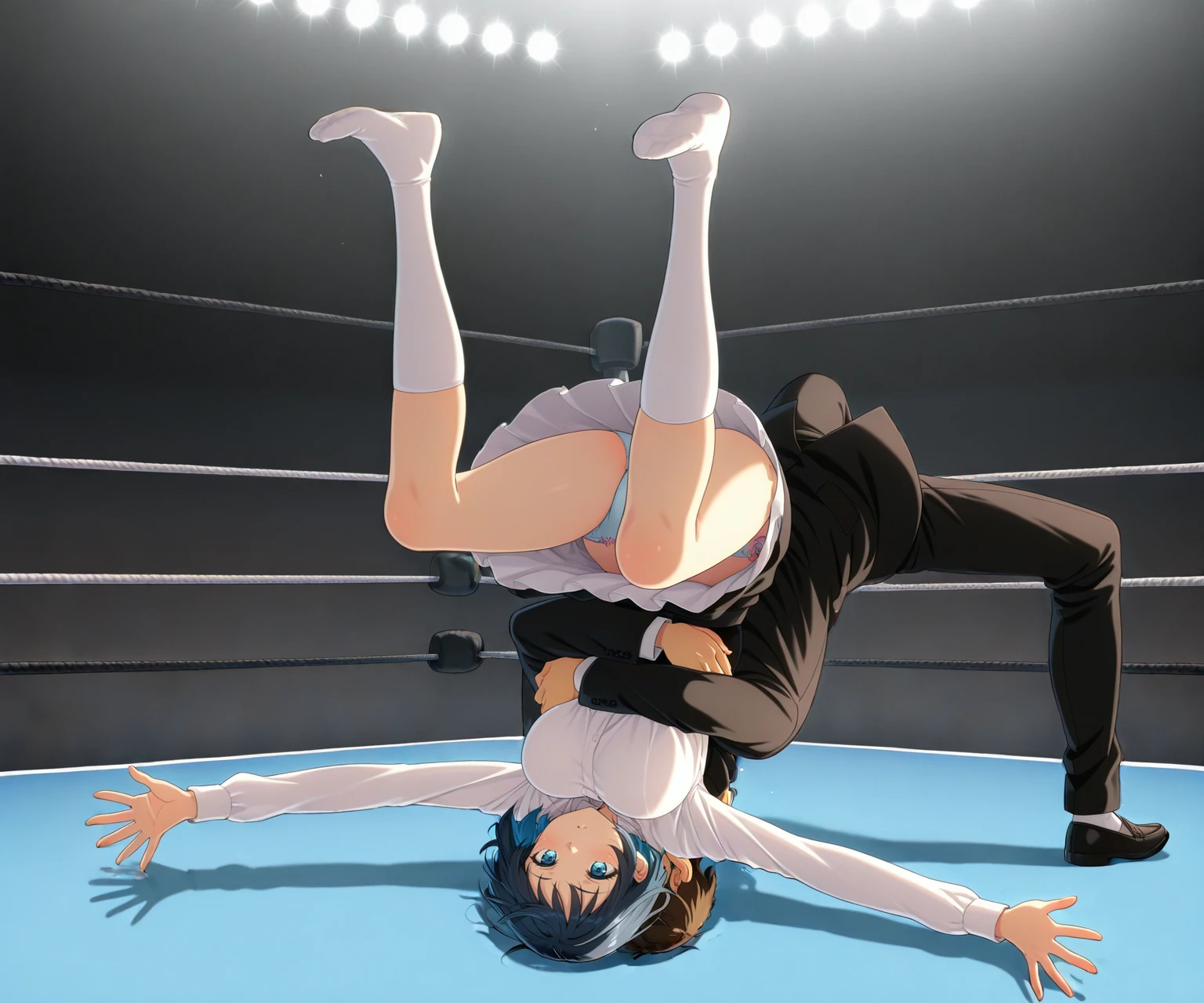A pose capturing the moment at the end of a German Suplex, where the opponent is slammed to the ground.