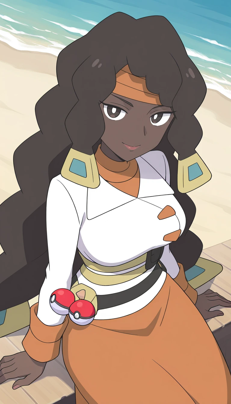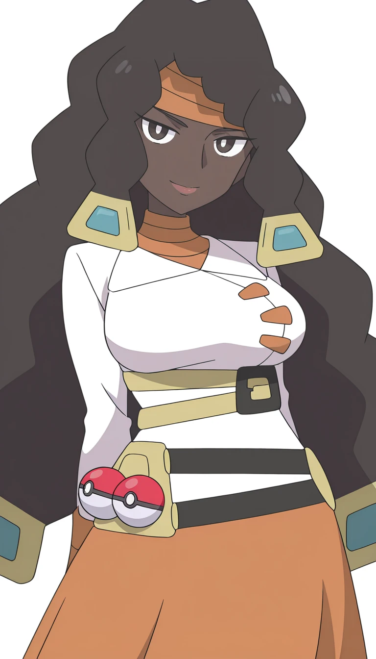 Outfit: orange headband, hair ornament, jacket, long sleeves, yellow high belt, black holster, poke ball, straps, long skirt, high heel boots