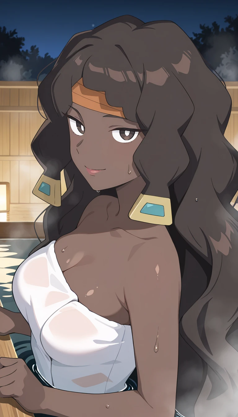 Appearance: Chalce_PKMN, dark brown eyes, white pupils, black hair, brown hair, long hair, wavy hair, dark-skinned female, lips, medium breasts