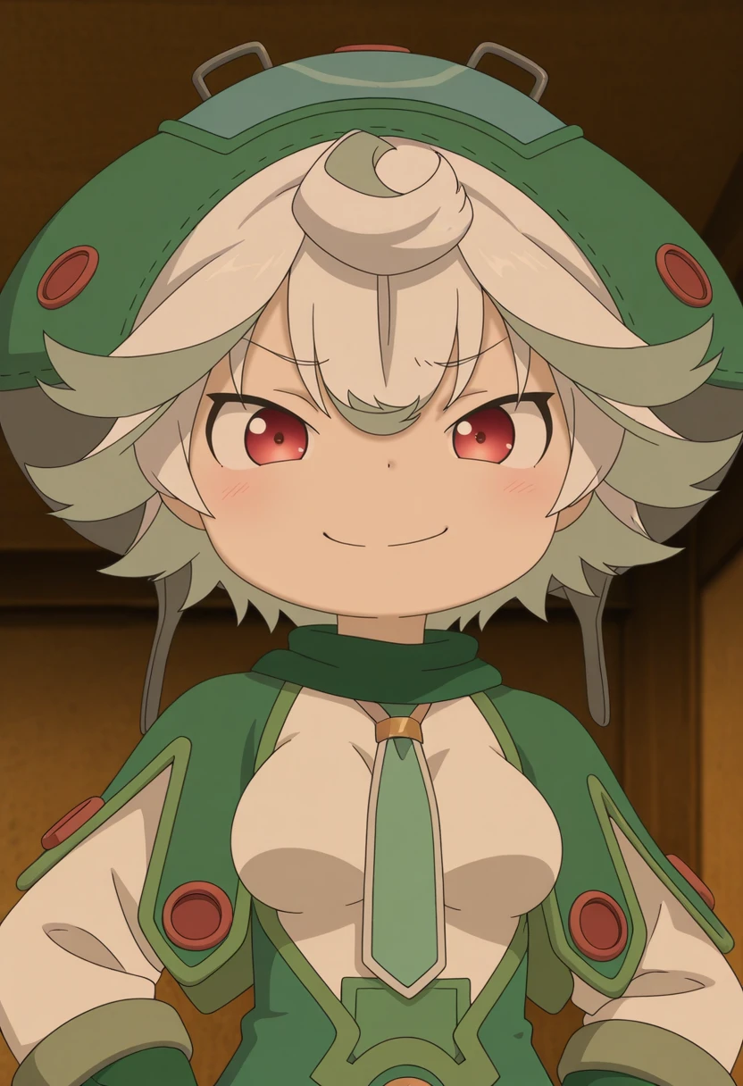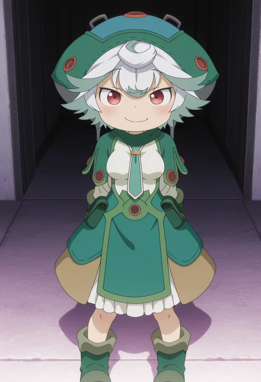 prushka, 1girl, red eyes, white hair, short hair, multicolored hair, green capelet, green dress, green hat, breasts, necktie, green gloves, body markings,