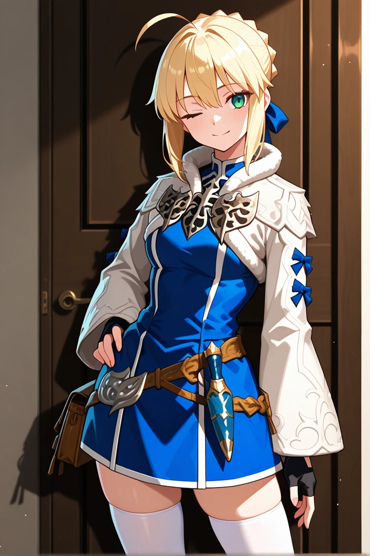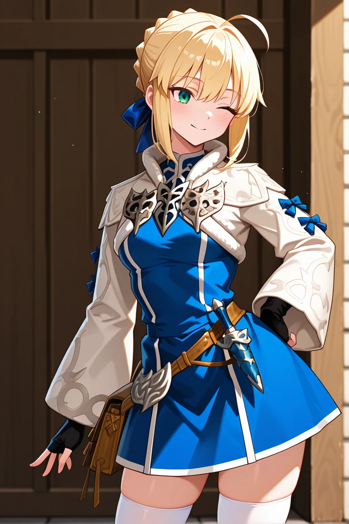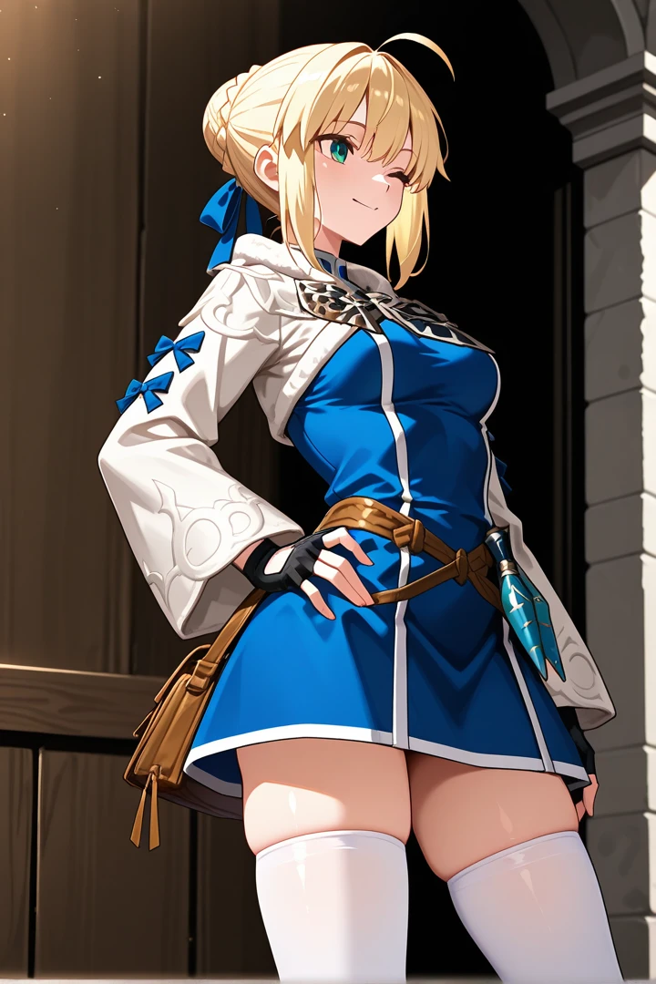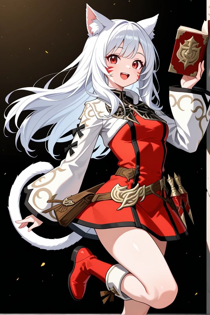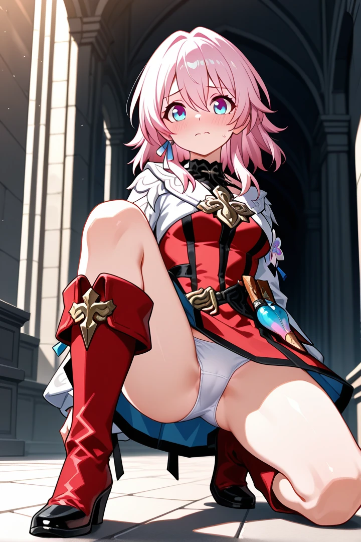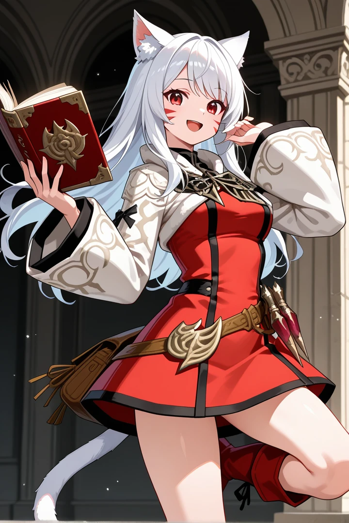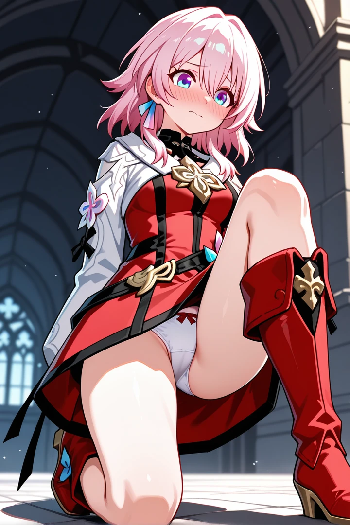 AstraCastOutfit, White cropped jacket, metal plate, red dress with black trim, brown belt, cyan vials, gold metal plate, brown purse, belt emblem, gold kneeguards, red and white astra_boots