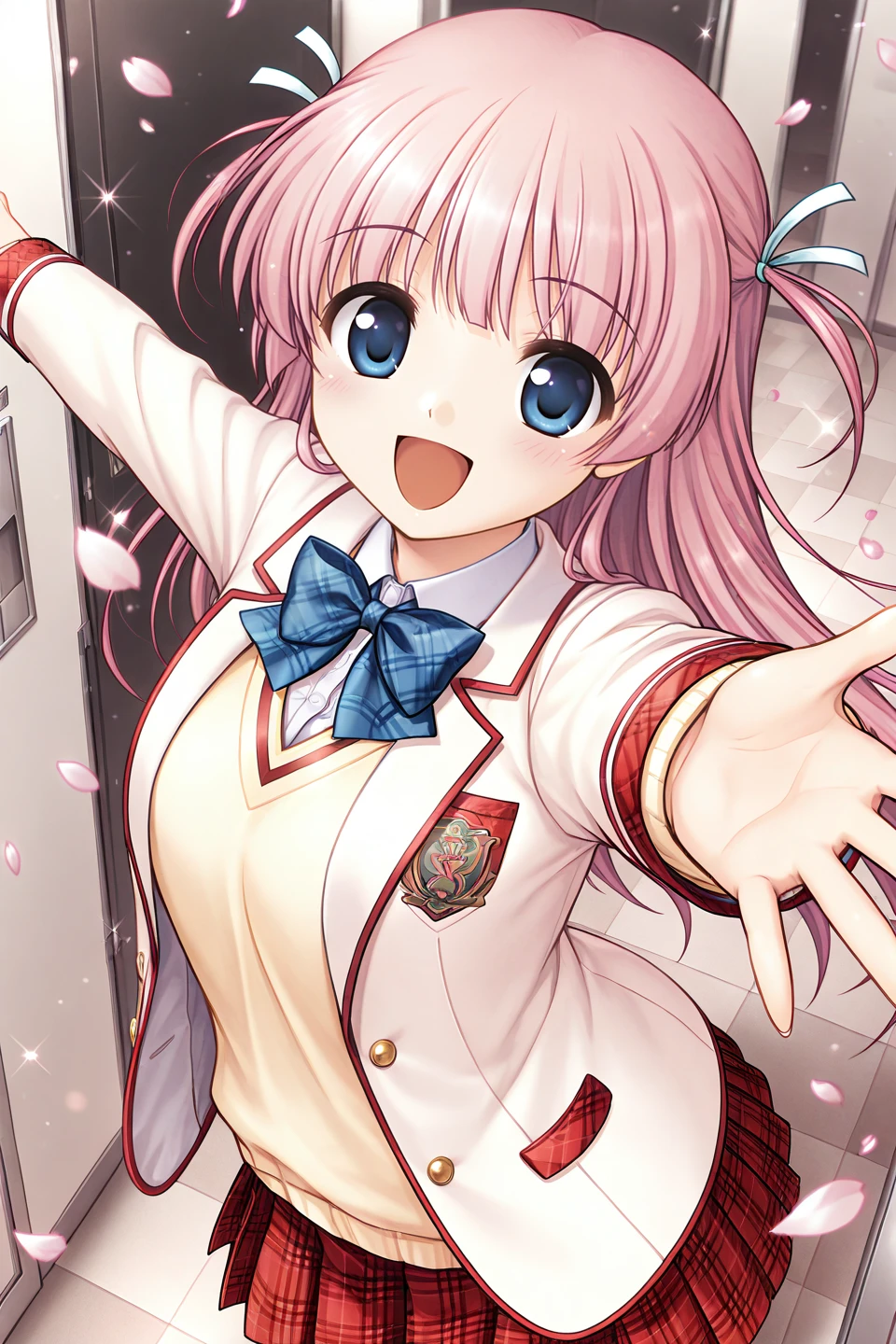 winter uniform,school uniform,blazer,pink jacket,open jacket,long sleeves,buttons,emblem,pocket,blue bowtie,plaid bowtie,yellow sweater,white shirt,collared shirt,red skirt,miniskirt,pleated skirt,plaid skirt,kneehighs,white socks,loafers,brown footwear,