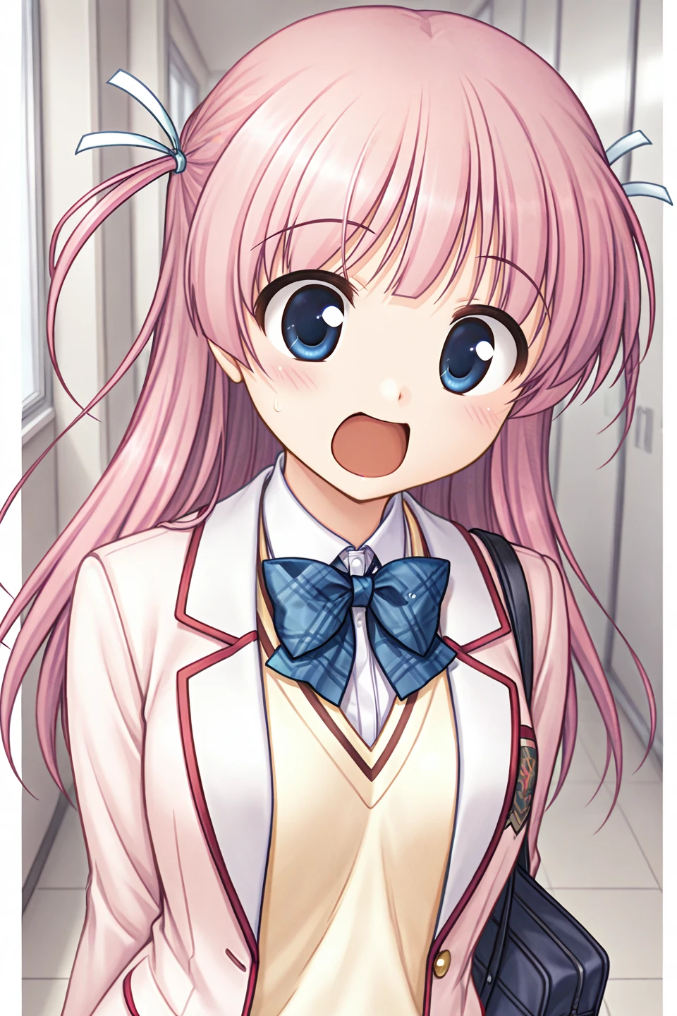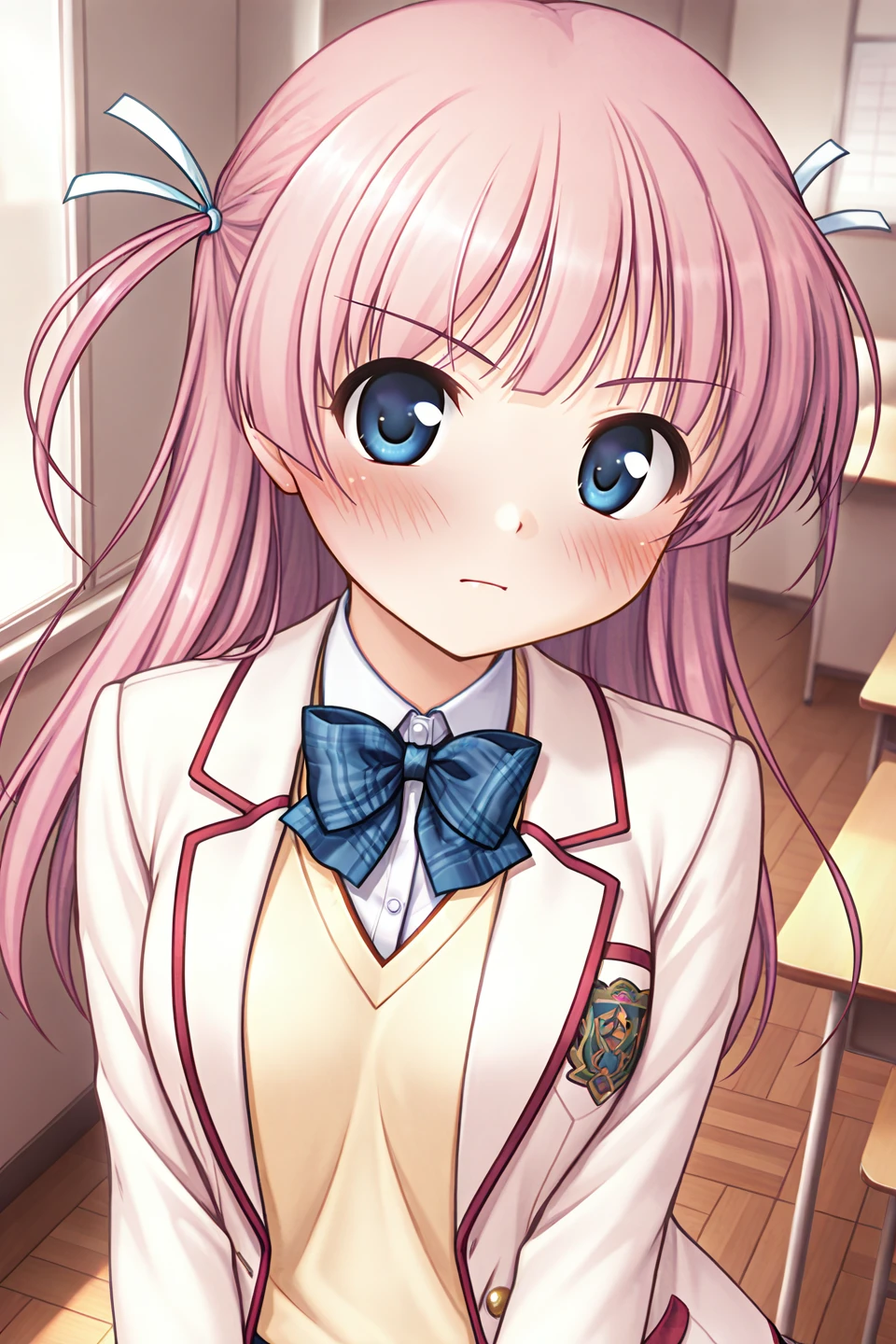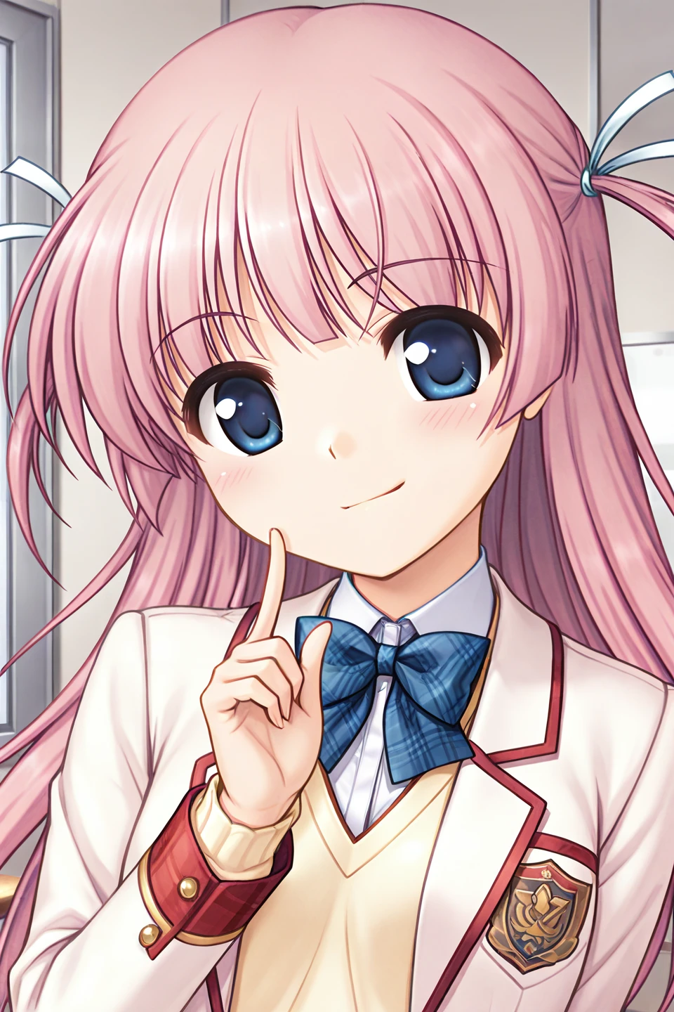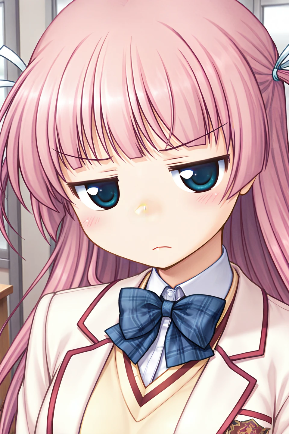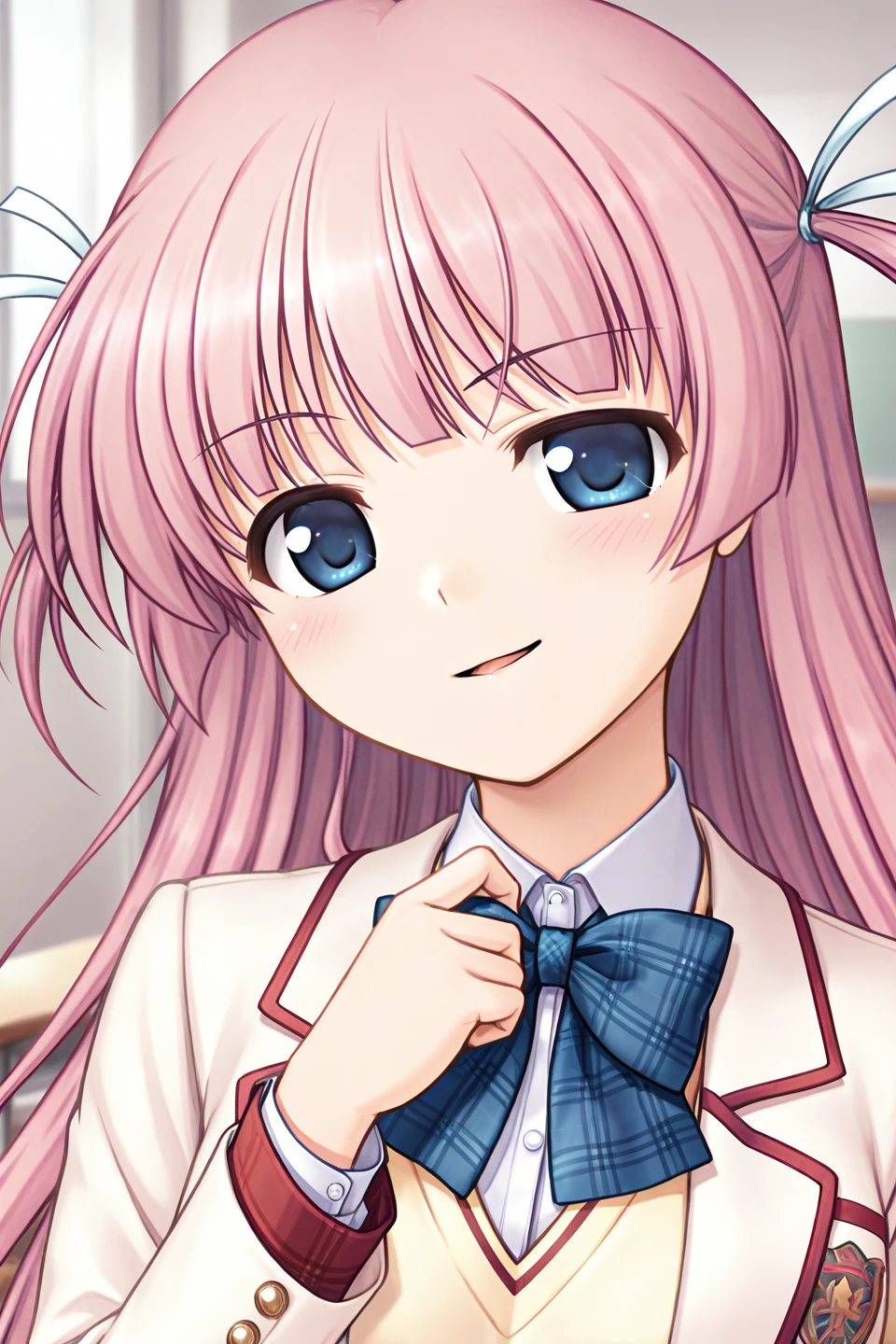 serizawa miyu,blue eyes,pink hair,very long hair,blunt bangs,sidelocks,two side up,white ribbon,hair ribbon,