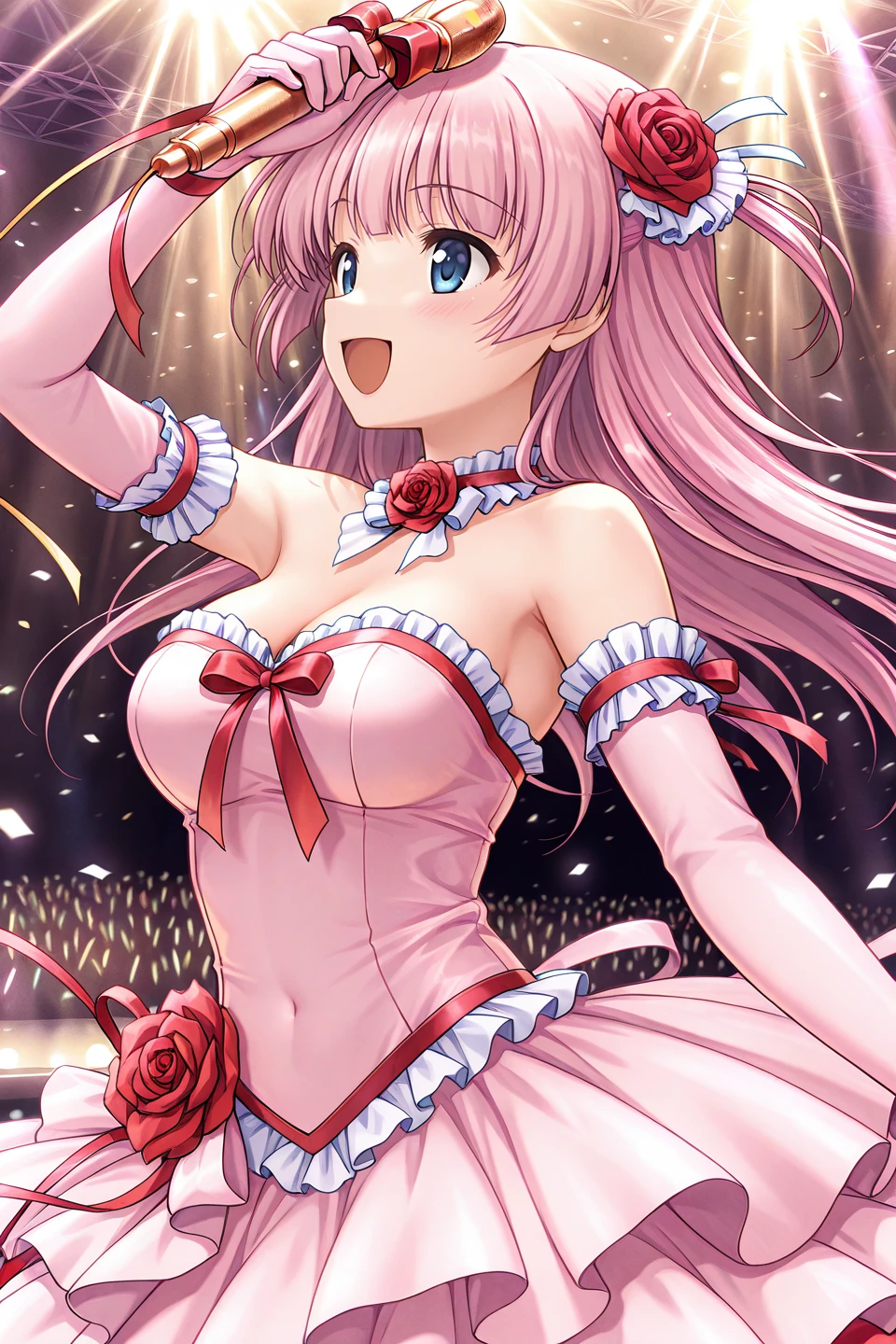 idol,hair flower,red rose,pink choker,neck flower,neck ribbon,pink dress,sleeveless dress,strapless dress,frilled dress,ribbon-trimmed derss,covered navel,red bowtie,red ribbon,bare shoulders,cleavage,pink gloves,arm ribbon,elbow gloves,frilled gloves,arm garter,layered skirt,frilled skirt,petticoat,