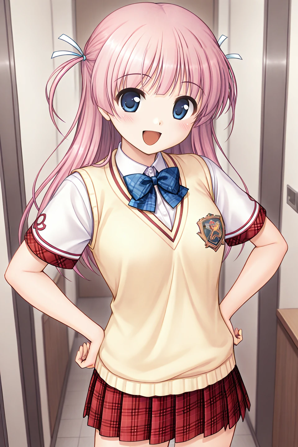 summer uniform,school uniform,yellow sweater vest,emblem,blue bowtie,plaid bowtie,white shirt,collared shirt,short sleeves,red skirt,miniskirt,pleated skirt,plaid skirt,kneehighs,white socks,loafers,brown footwear,