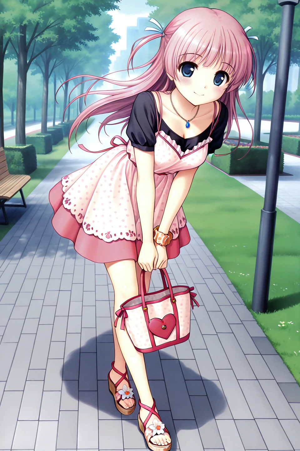 casual,collarbone,bead necklace,blue gemstone,pink camisole,lace-trimmed camisole,print camisole,heart print,camisole over clothes,black shirt,short sleeves,wrist scrunchie,orange scrunchie,plaid scrunchie,pink skirt,miniskirt,bare legs,sandals,flower sandals,pink footwear,platform footwear,toeless footwear,