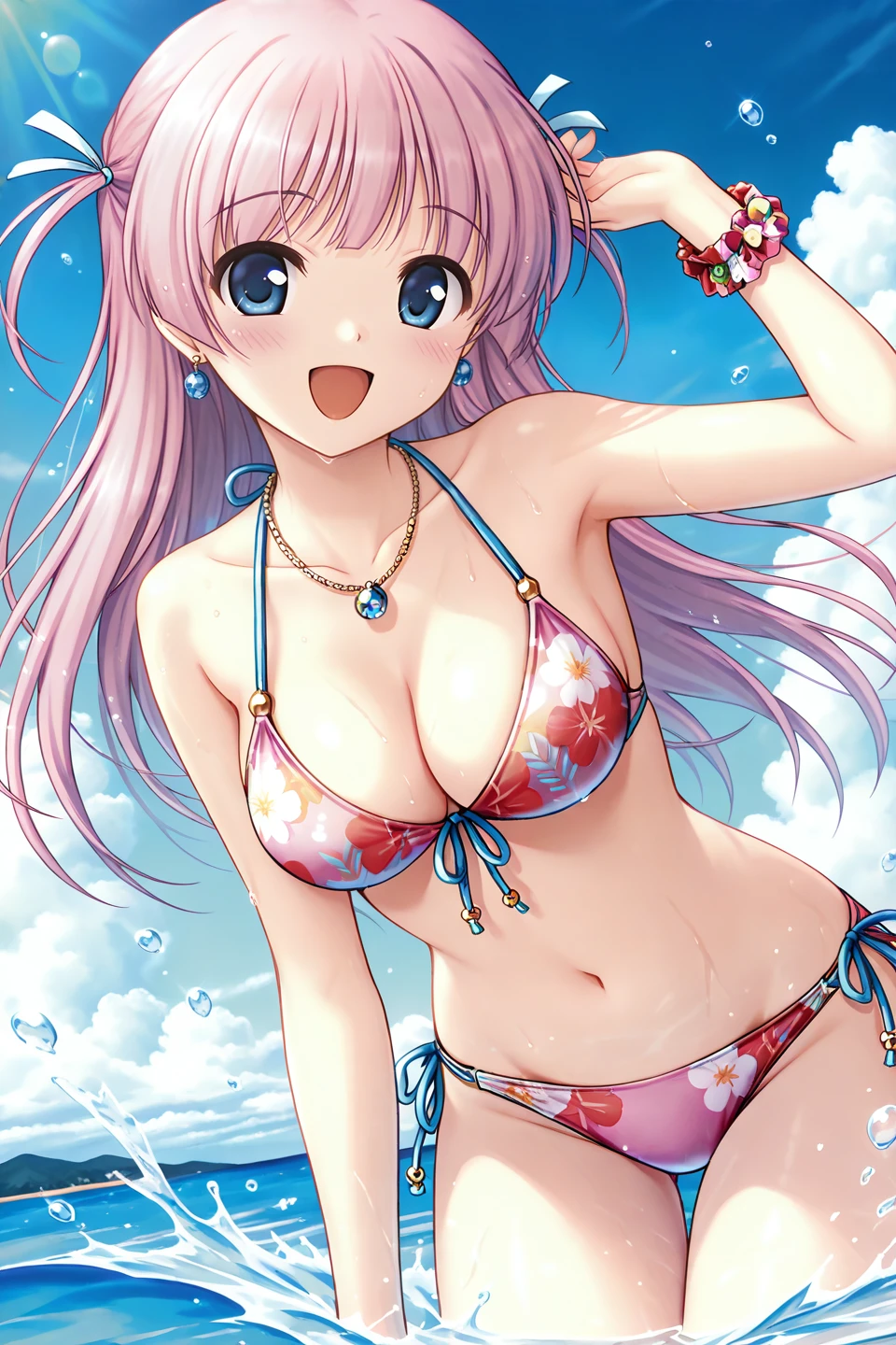 swimsuit,(pink bikini:1.3),string bikini,front-tie bikini top,print bikini,floral print,halterneck,collarbone,earrings,bead necklace,cleavage,bare shoulders,wrist scrunchie,stomach,navel,side-tie bikini bottom,shiny skin,shiny hair,