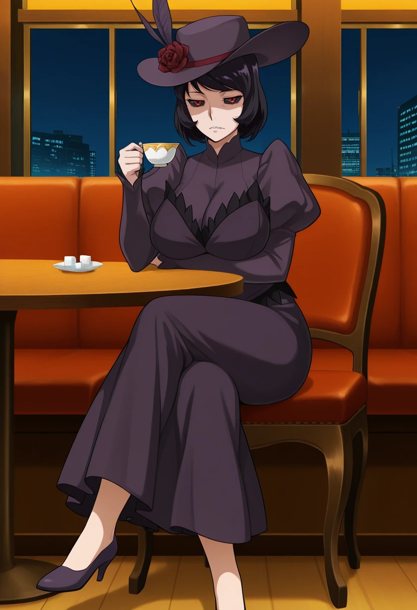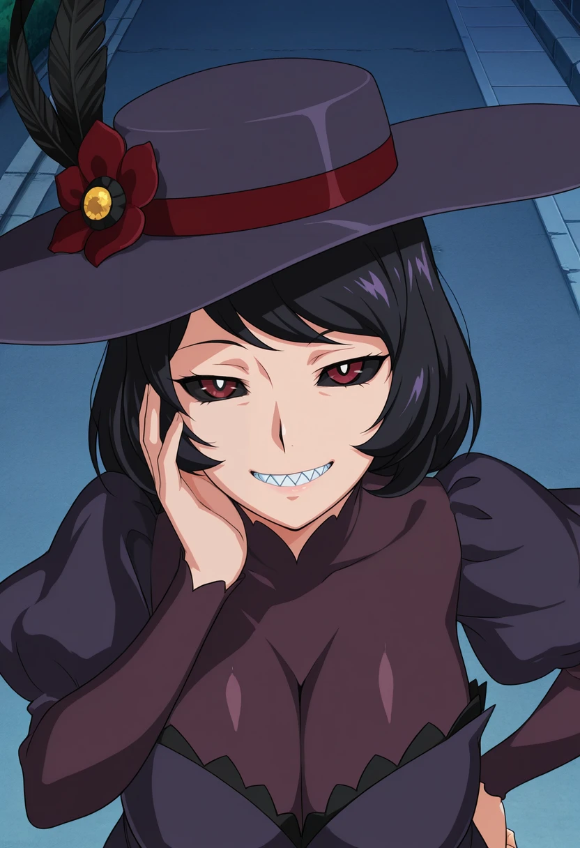AkemiHuman, 1girl, solo, short hair, black hair, dark red eyes, black pupils, black sclera, sharp teeth, dark purple hat, dark purple dress, ?????????????, curvy, wide ????, cleavage, hat feather, hat flower, puffy sleeves, mature female, long sleeves, long dress, long skirt, dark purple shoes, elegant shoes, high heels,Human Optional Outfit:
