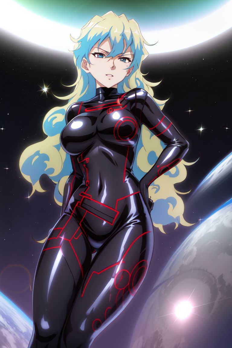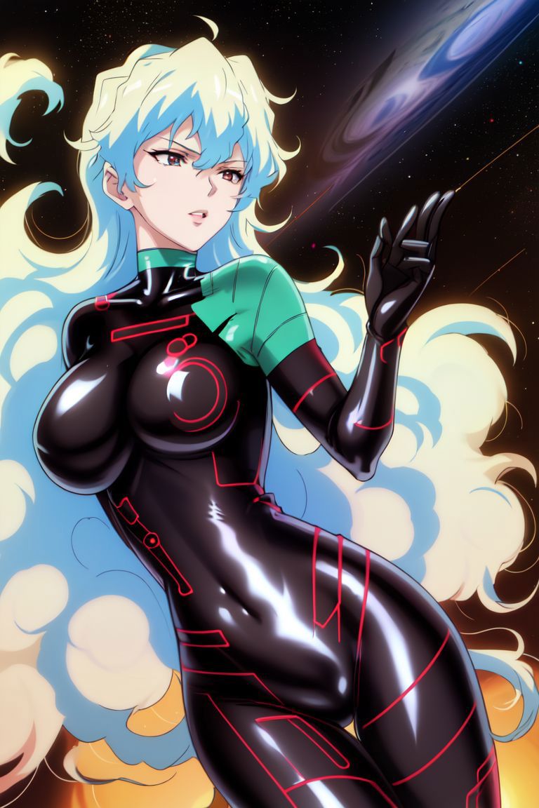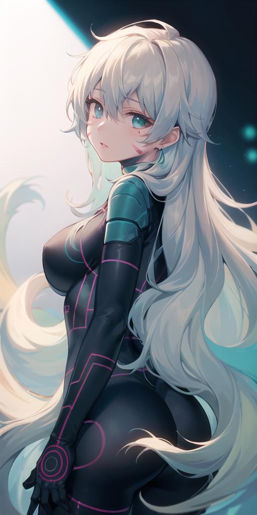 antispiral nia:antispiral nia, 1girl, absurdly long hair, bodysuit,earrings, facial mark, glowing lines,jewelry,whorled hair