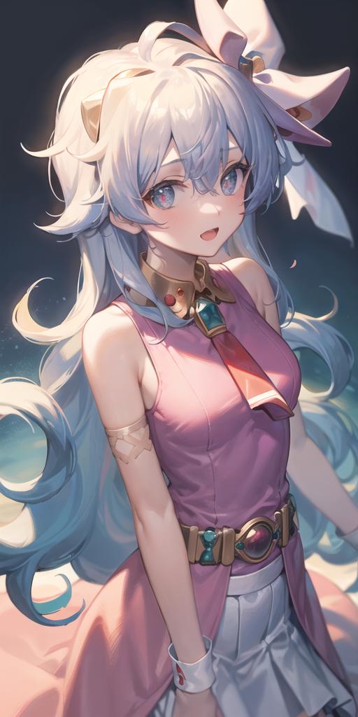 nia teppelin: + +, 1girl,curly hair, flower,hair ornament, long hair, long sleeves, multicolored hair, pink dress, red neckwear, two-tone hair, white cape, nia teppelin