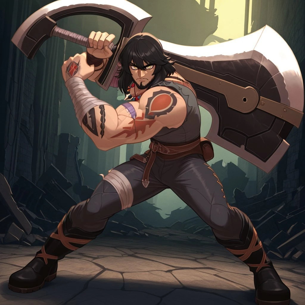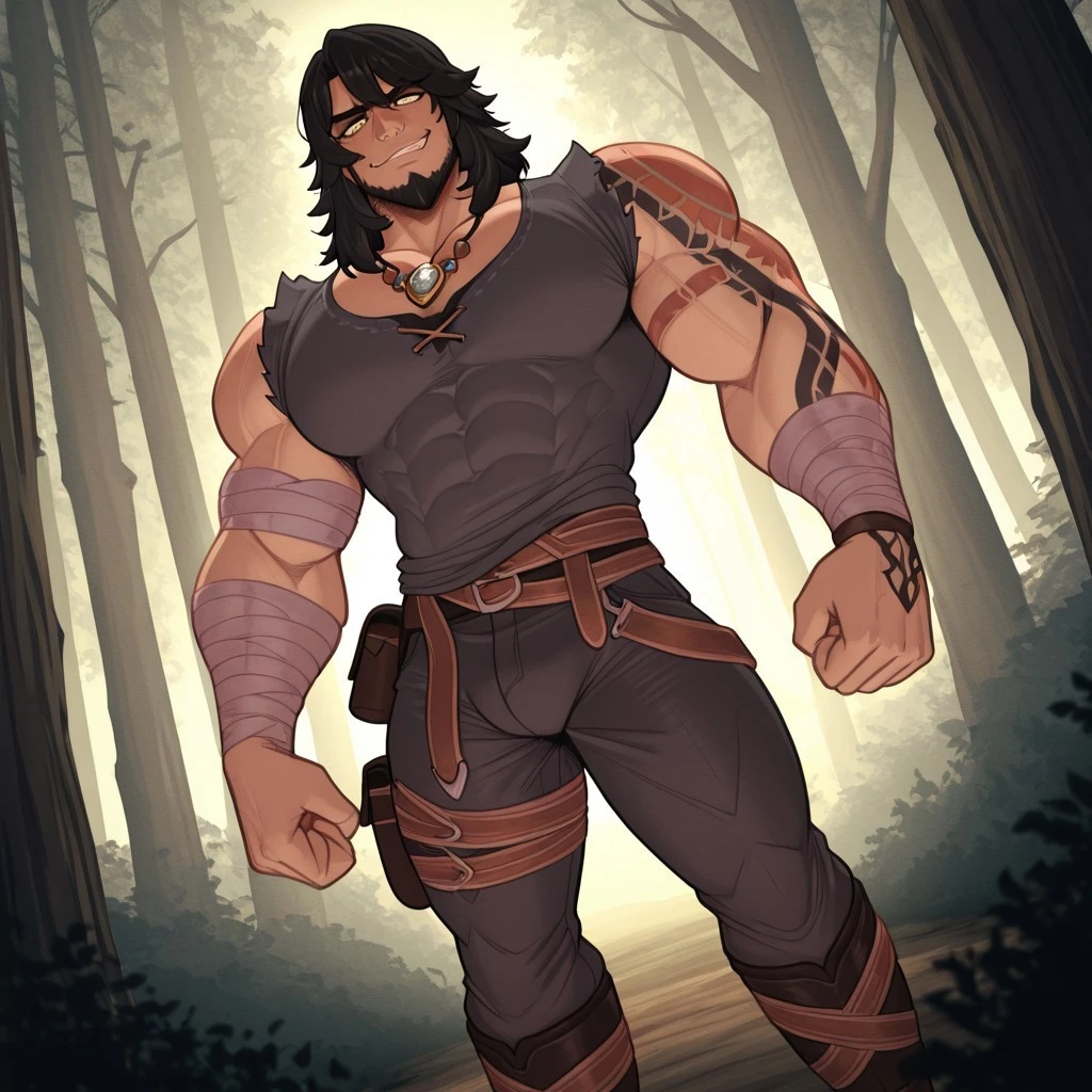 black hair, beard, dark grey clothes, leather straps, worn out bandages
