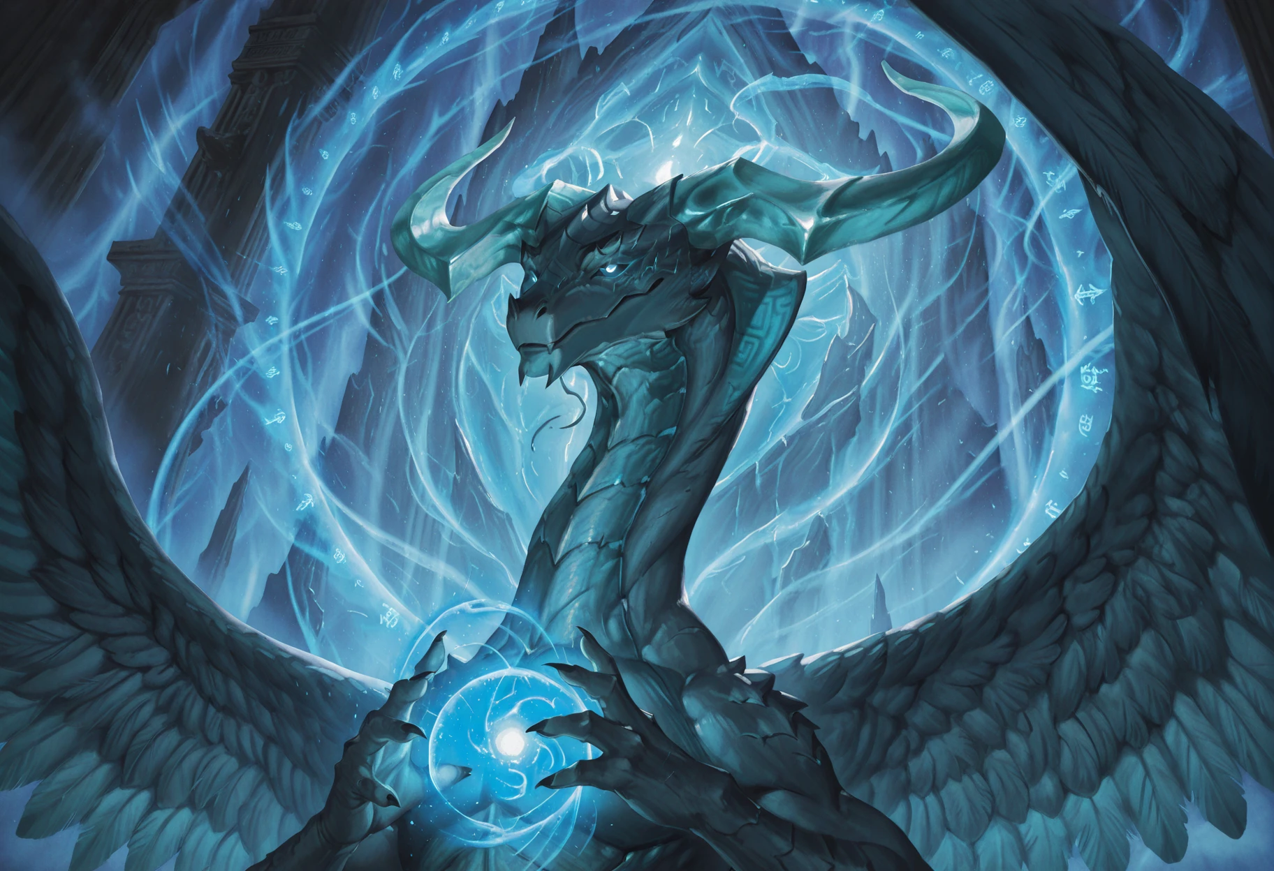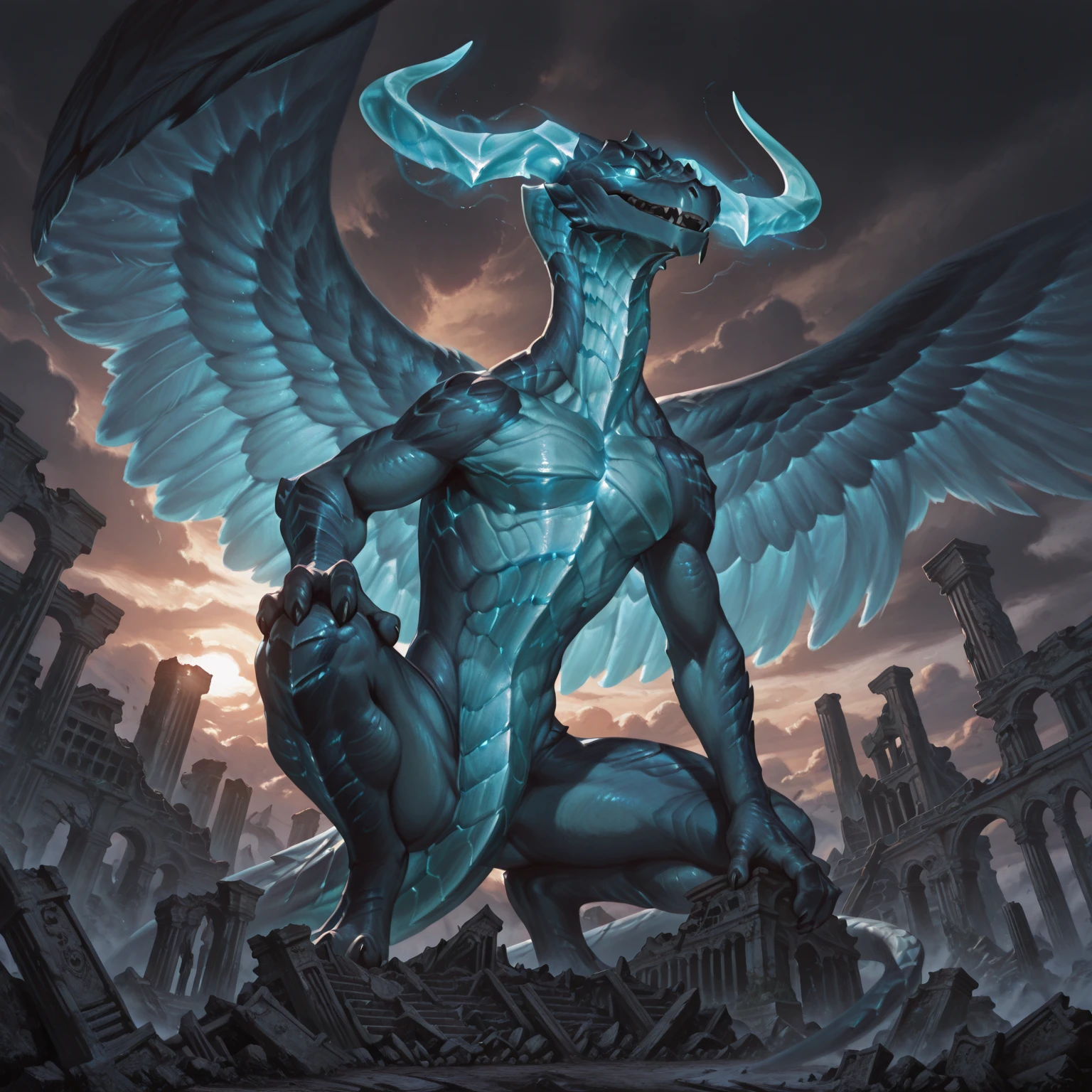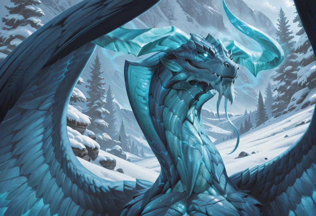 Tags: dragon, curved horns, light blue scales, semi-anthro, no humans, feathered wings, tail, thin beard, glowing eyes