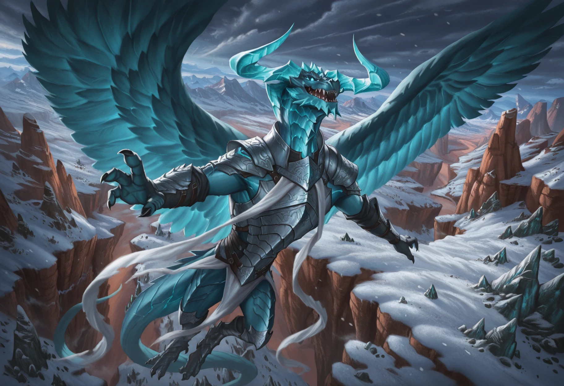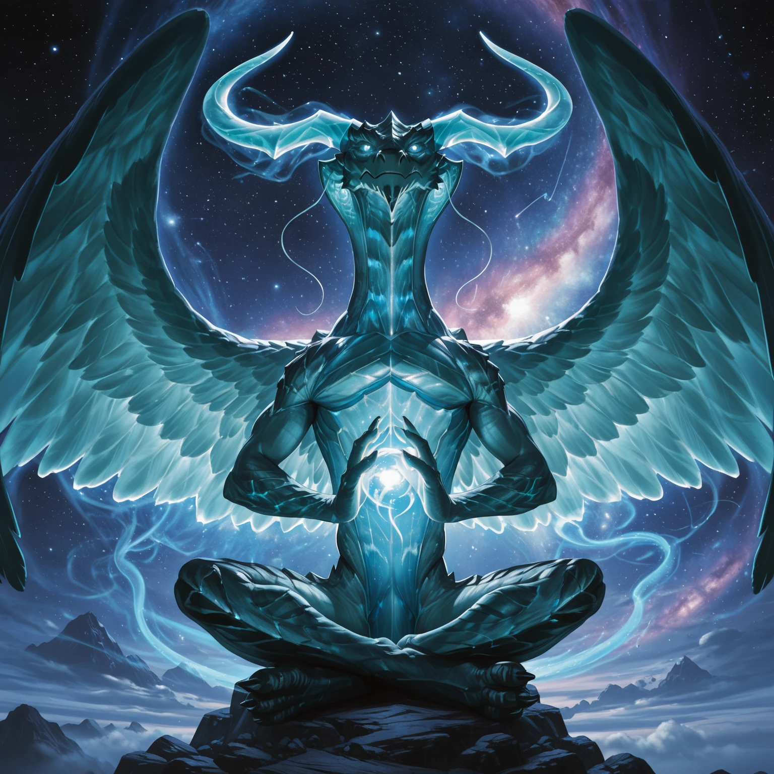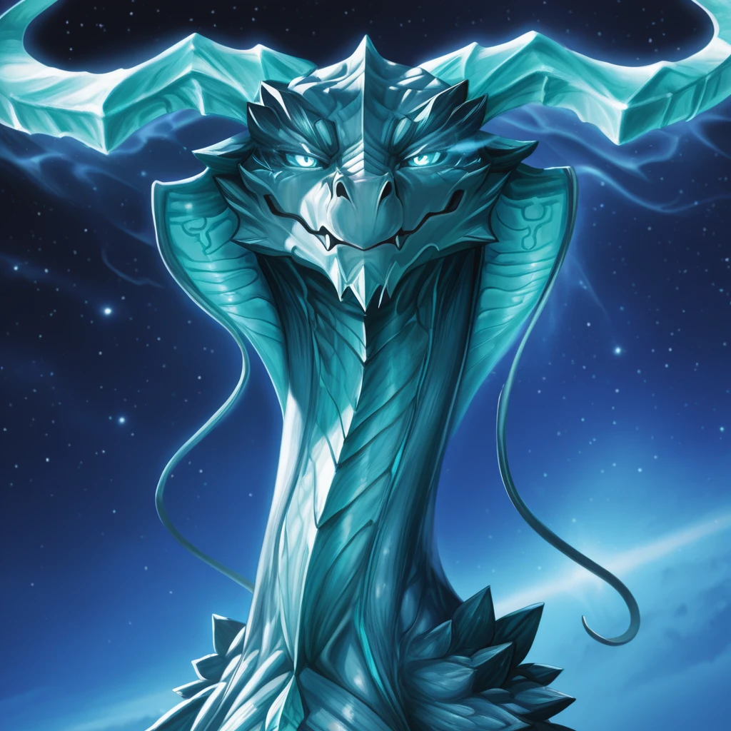 Tags: dragon, curved horns, light blue scales, semi-anthro, no humans, feathered wings, tail, thin beard, glowing eyes