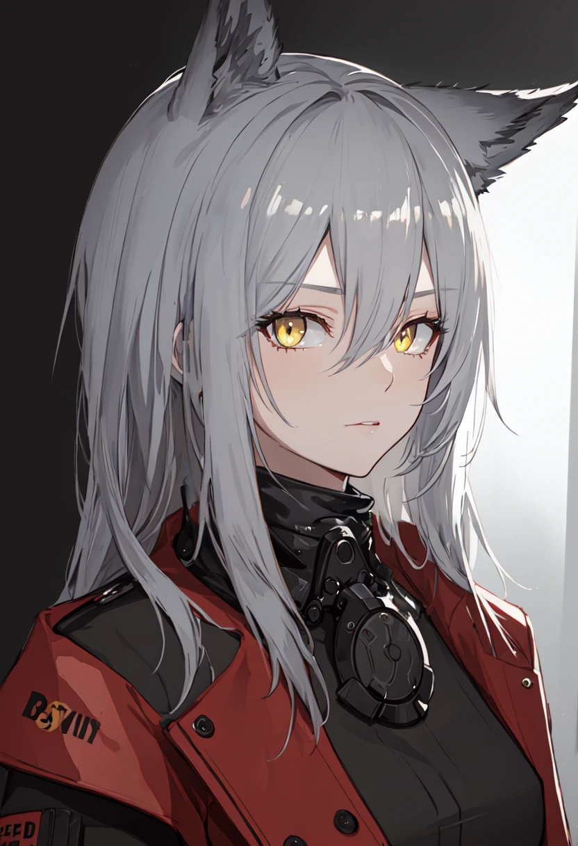 The trigger word is projekt_red_arknights, and the pruned tags are animal_ears, wolf_ears, grey_hair, hair_between_eyes, wolf_girl, yellow_eyes, tail, wolf_tail, long_hair, breasts.