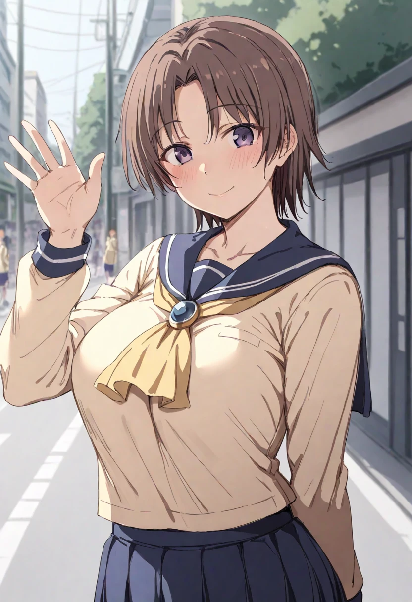 school uniform,sailor collar,long sleeves,beige shirt,ascot,brooch,blue skirt