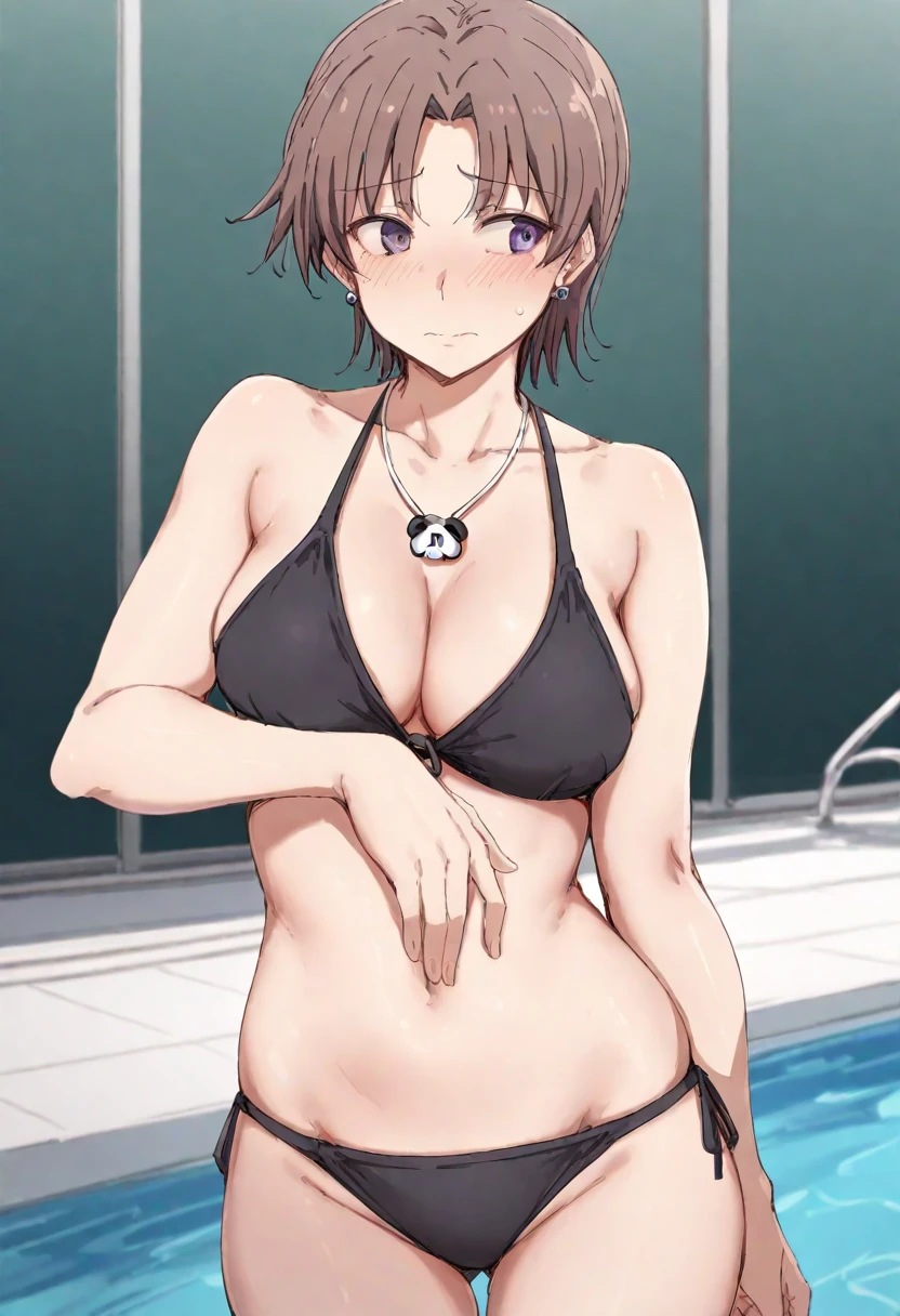 default,shishido_yui, 1girl, brown hair, short hair,purple eyes,white jacket,pink t-shirt,purple pencil skirt,panda necklace