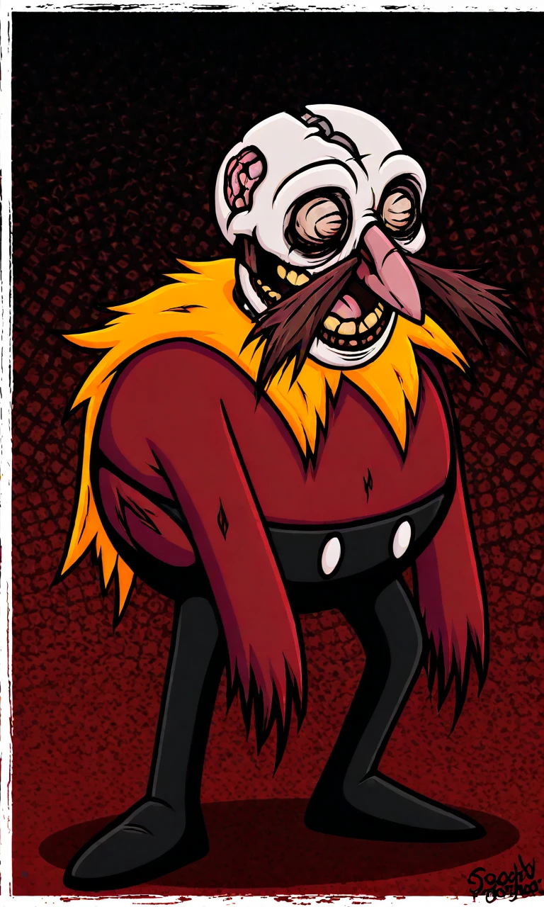 SoulEggmanEXE, 1boy, round body, red shirt, torn yellow short cape, black pants, black shoes, bald head, pale Skin, bushy mahogany brown mustache, fat, chubby, round, split head, brain, jaw hangs open limply, handless, horror, pink nose, yellow teeth