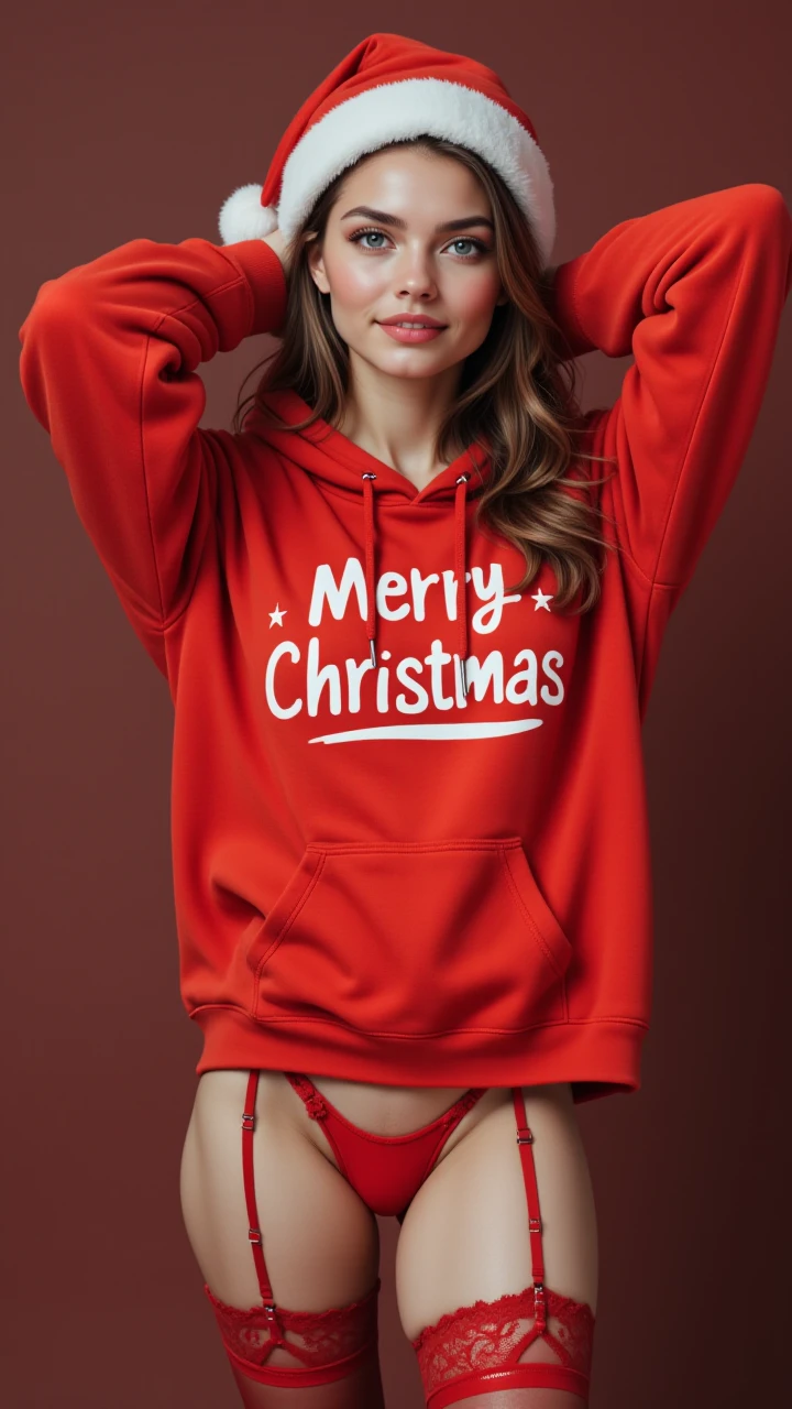 wearing a red Jedxmas Hoodie ,Merry Christmas Print, red Jedxmas garter straps, long sleeves, red Jedxmas thong, red Jedxmas stockings, santa hat