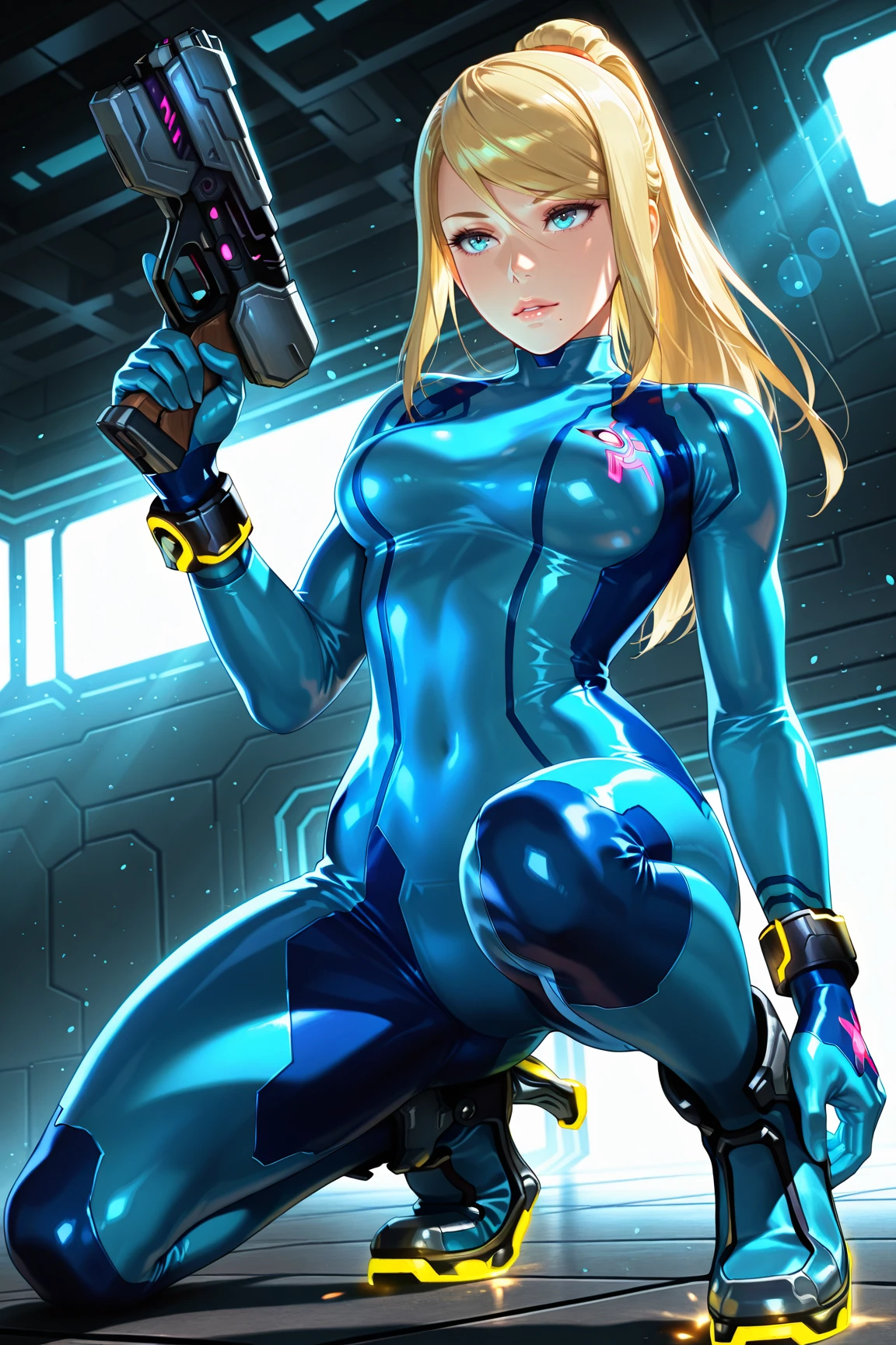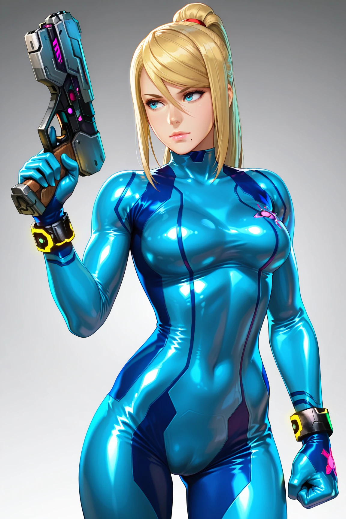 samus_aran, zero_suit, 1girl, long hair, medium breasts, blue eyes, blonde hair, hair between eyes, high heel boots, bracelet, swept bangs, sidelocks, high ponytail, hair tie, skin tight, mole under mouth, blue bodysuit, turtleneck, neon trim, emblem
