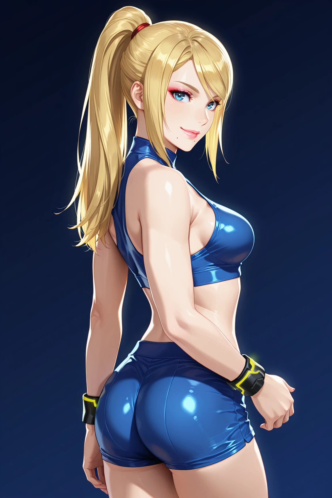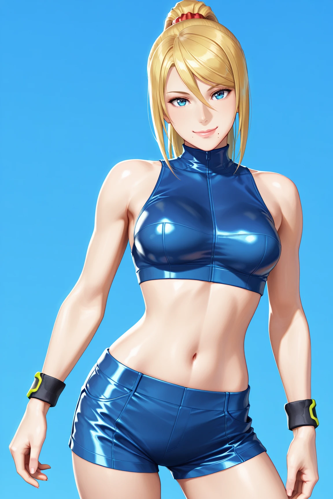 54mu5_4r4n, sport_suit, 1girl, long hair, blue eyes, blonde hair, navel, hair between eyes, bare shoulders, medium breasts, sidelocks, blue shorts, sleeveless, midriff, bracelet, blue crop top, short shorts, swept bangs, turtleneck, halterneck, hair tie, high ponytail, knee boots, mole under mouth, skin tight, high heel boots, blue boots, sports bra, neon trim