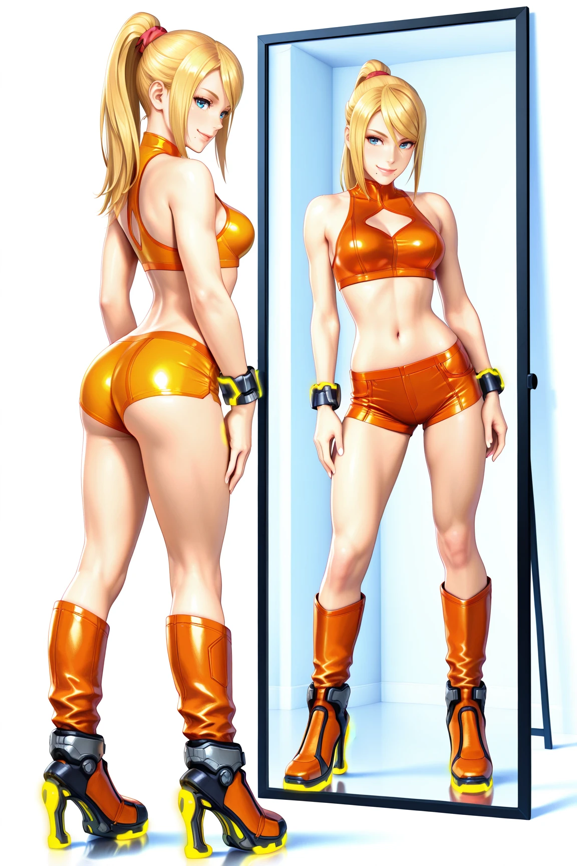 54mu5_4r4n, alternative_suit, 1girl, long hair, blue eyes, blonde hair, navel, hair between eyes, bare shoulders, medium breasts, sidelocks, orange boots, sleeveless, midriff, bracelet, orange crop top, short shorts, swept bangs, turtleneck, halterneck, cleavage cutout, hair tie, high ponytail, mole under mouth, skin tight, high heel boots, orange shorts, knee boots, neon trim, sports bra