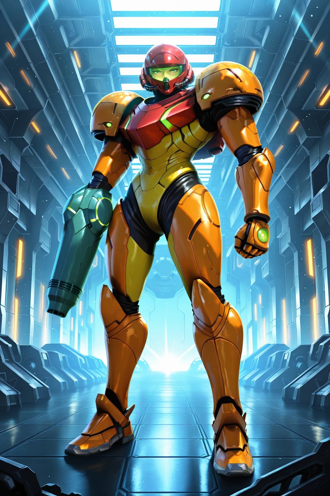 54mu5_4r4n, power_suit, 1girl, orange armor, red helmet, science fiction, weapon, arm cannon, full armor, power armor, green assault visor, neon trim