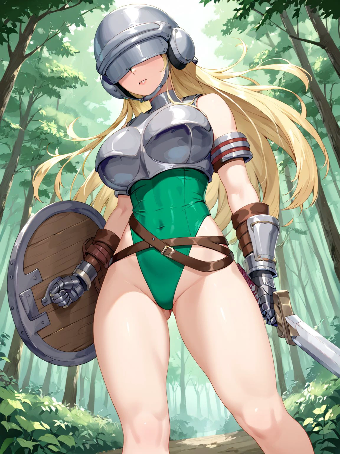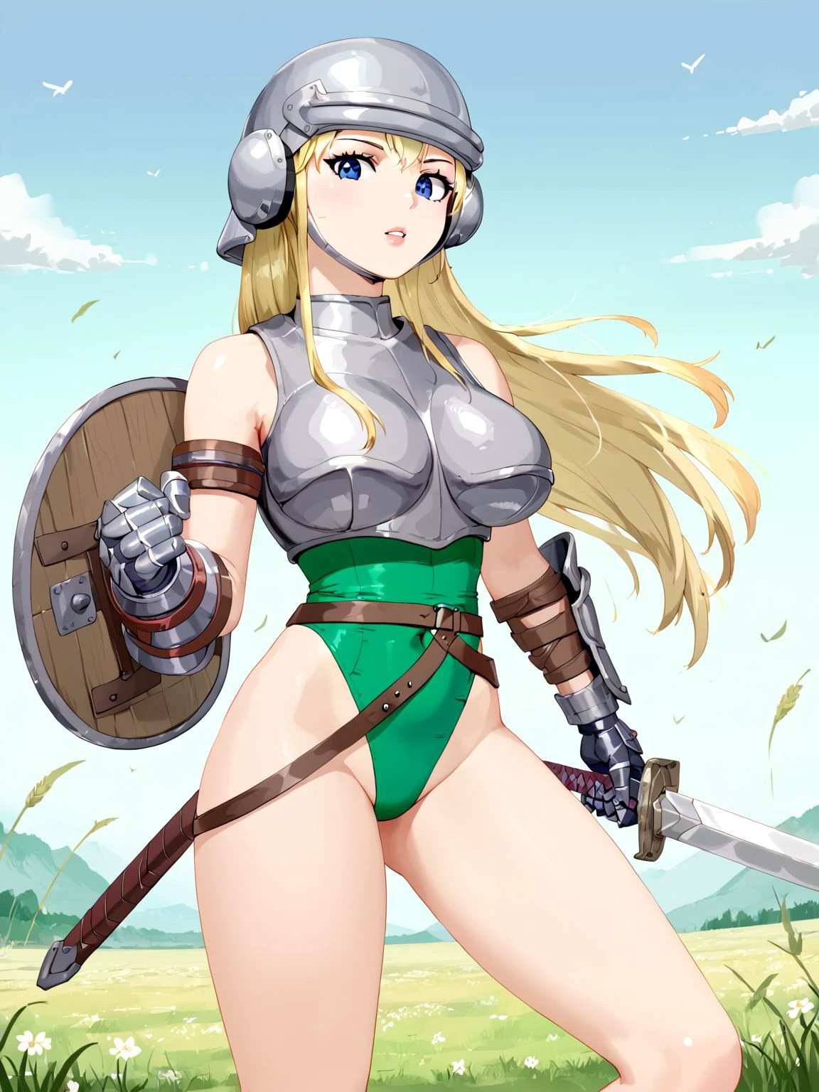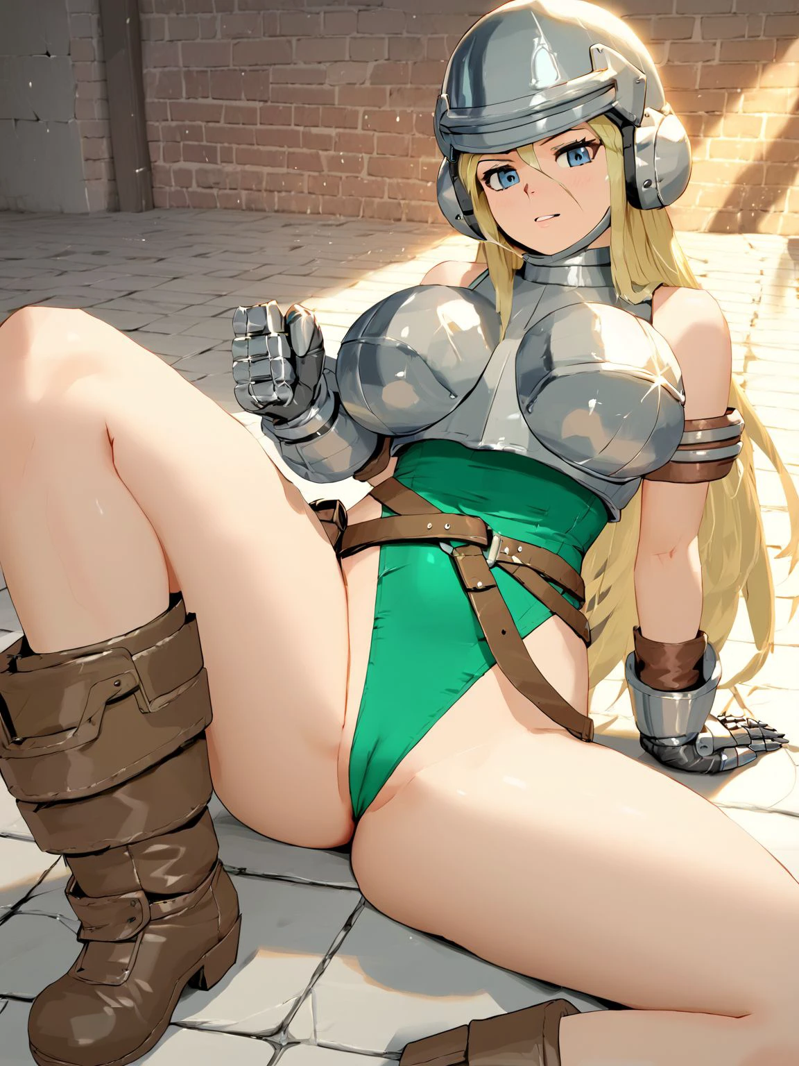 long hair,blonde hair,blue eyes,helmet,armor,breastplate,gloves,gauntlets,leotard,green leotard,highleg leotard,belt,boots,sheath,