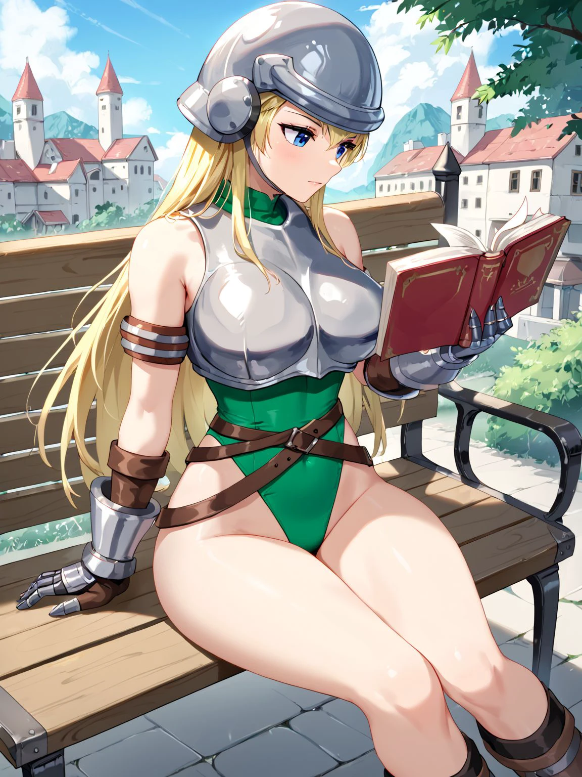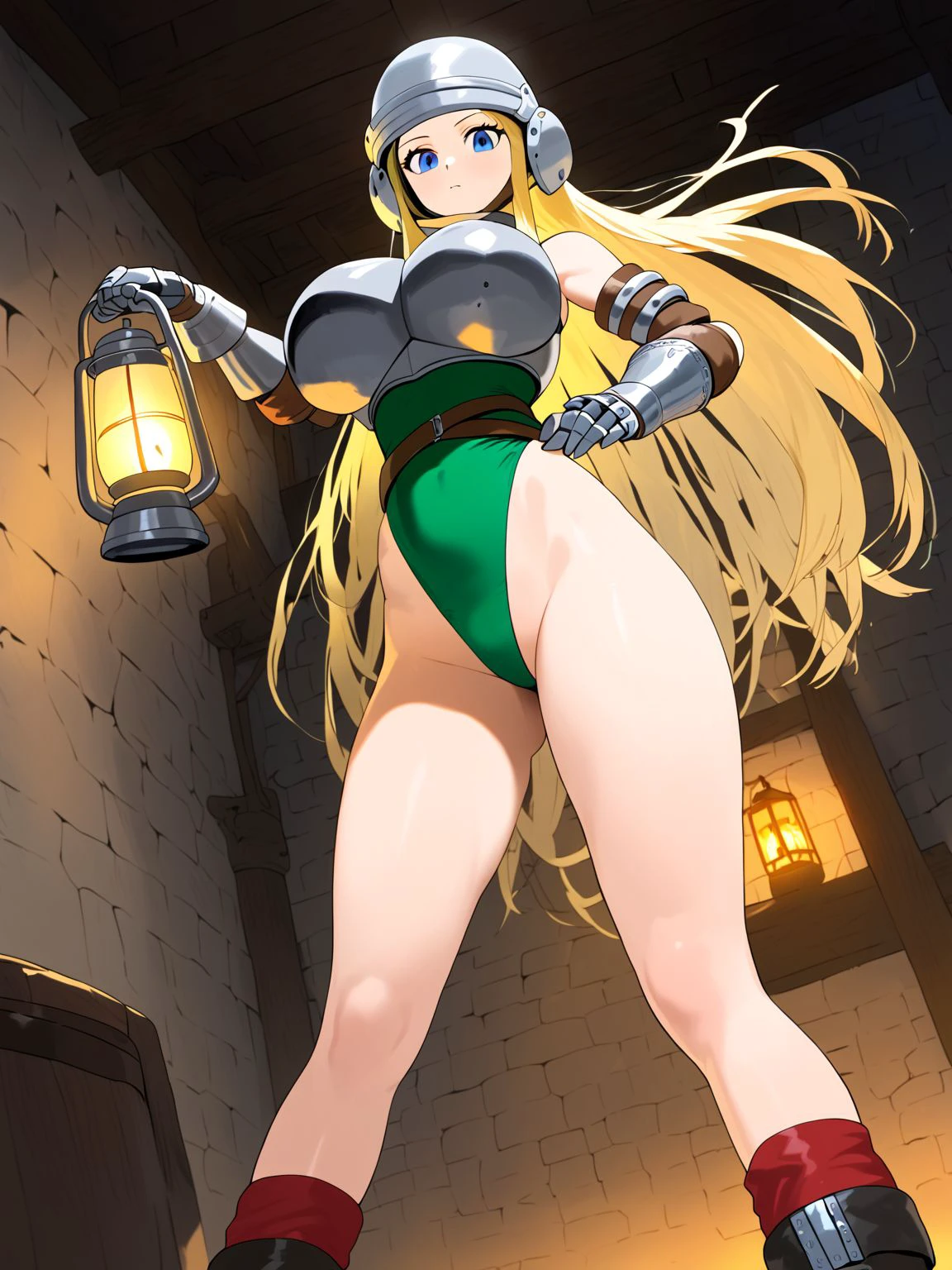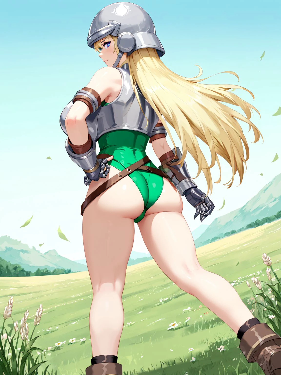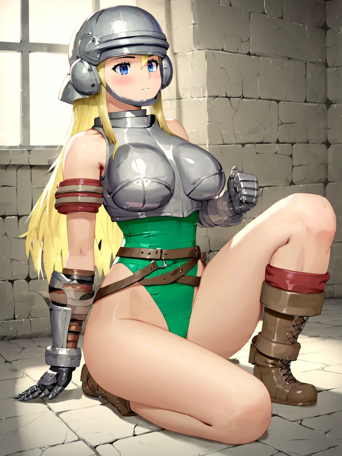long hair,blonde hair,blue eyes,helmet,armor,breastplate,gloves,gauntlets,leotard,green leotard,highleg leotard,belt,boots,sheath,