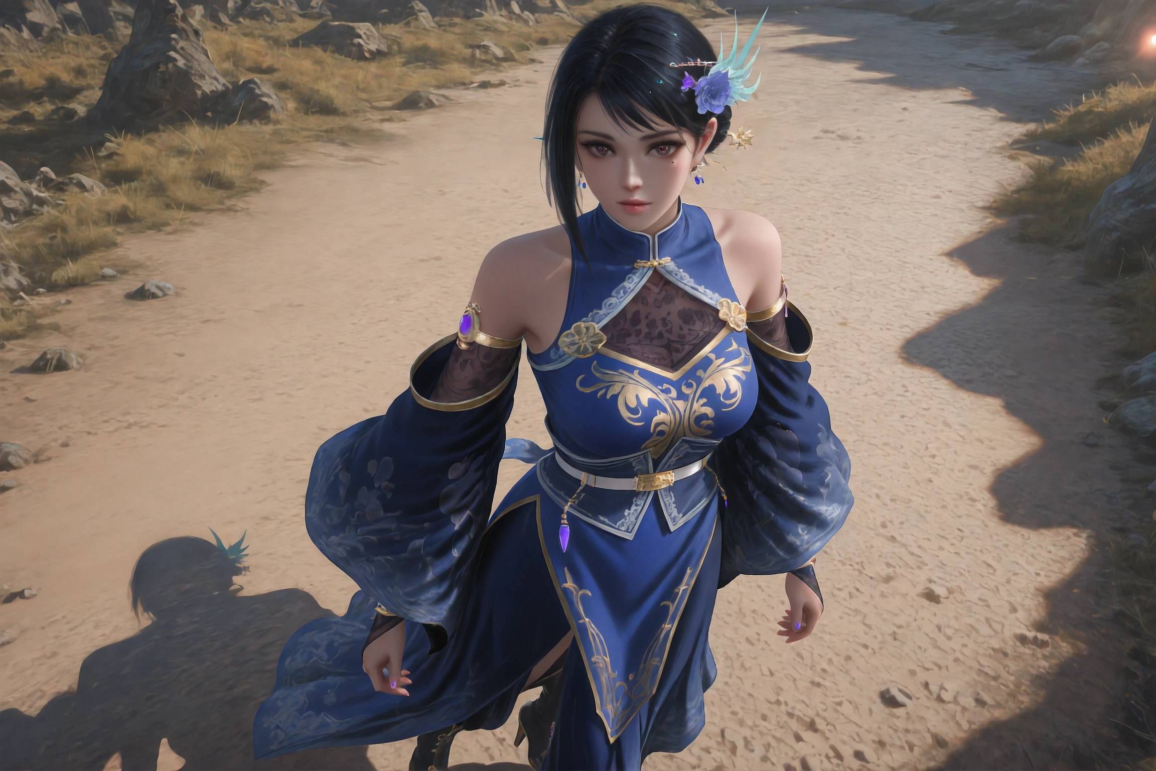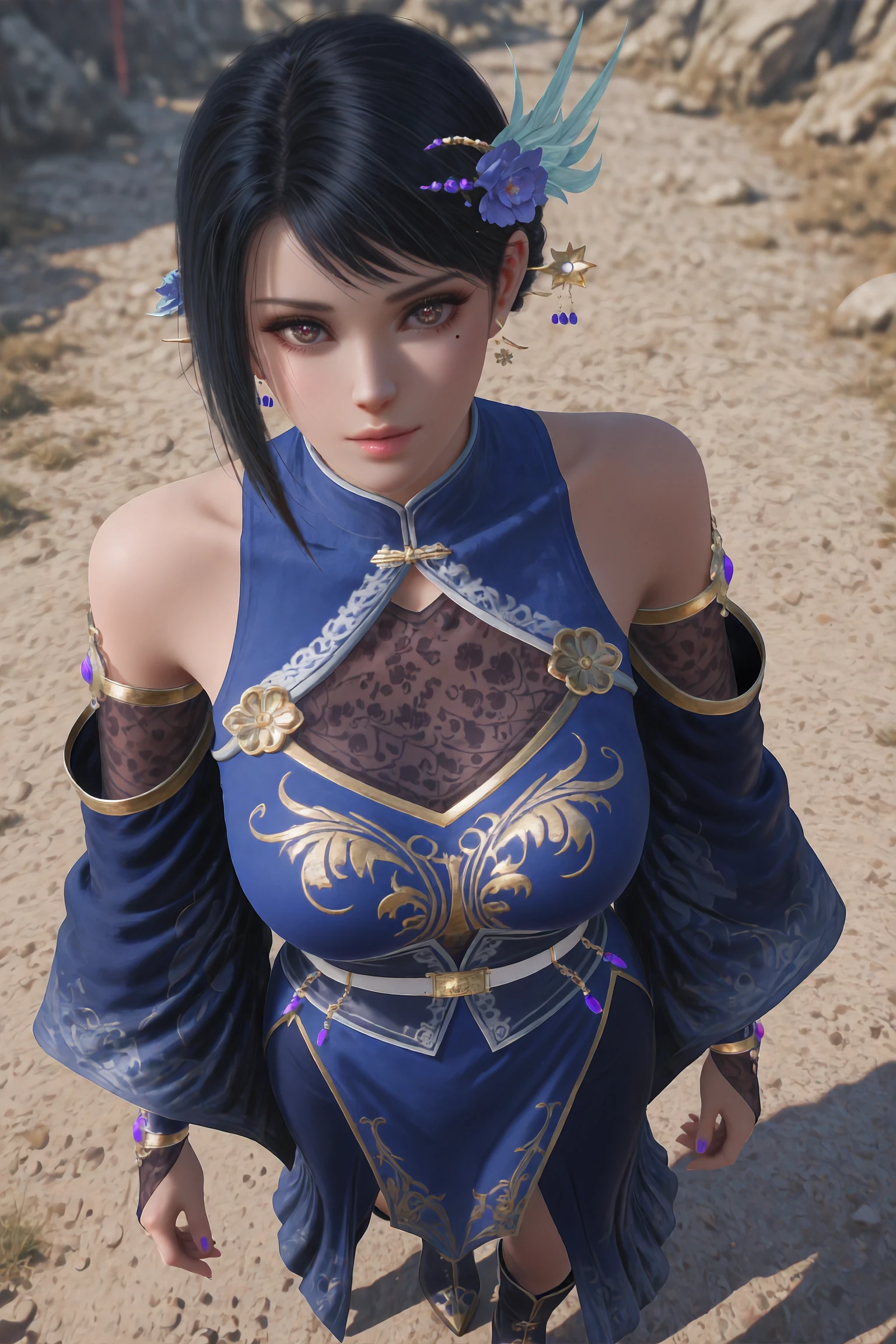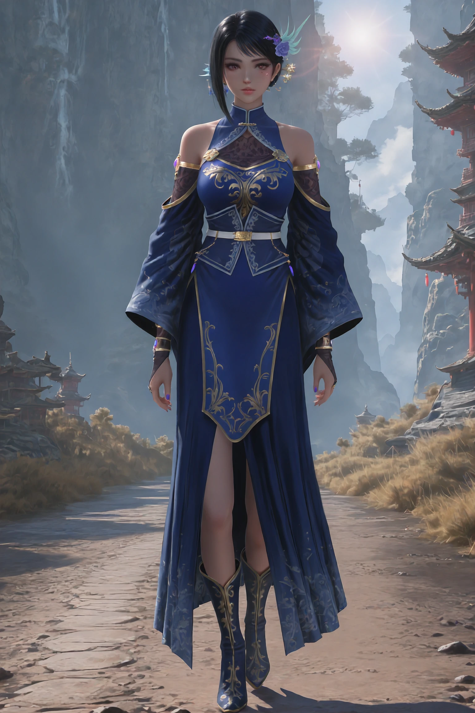 ZhenjiOrigin,asian,black hair,hair ornament,dress,earrings,detached sleeves,jewelry,blue dress,bare shoulders,bridal gauntlets,nail polish,high heel boots,wide sleeves,short hair,brown eyes,blue dress,mole under eye,hair flower,hair bun,belt,chinese clothes,