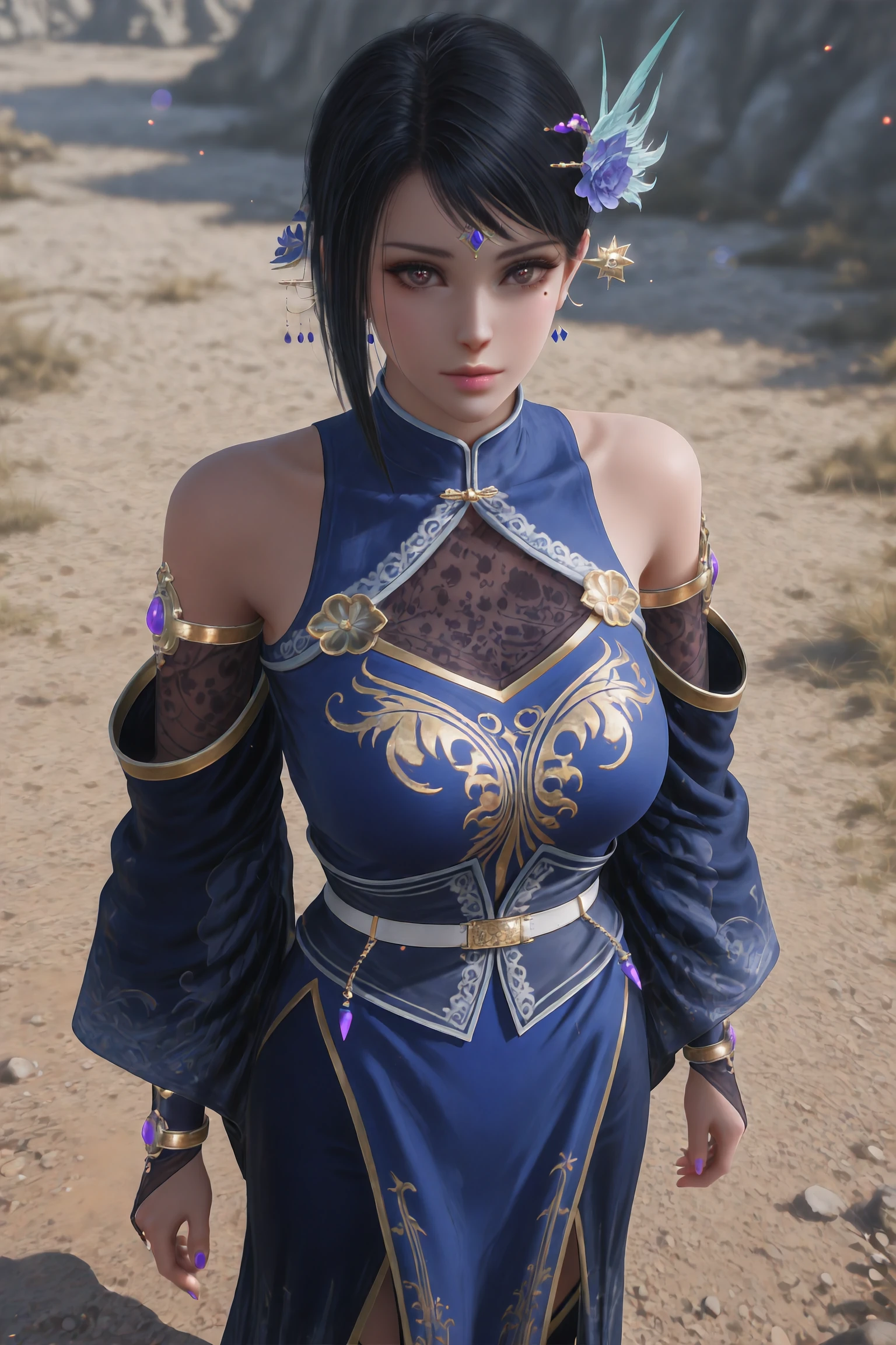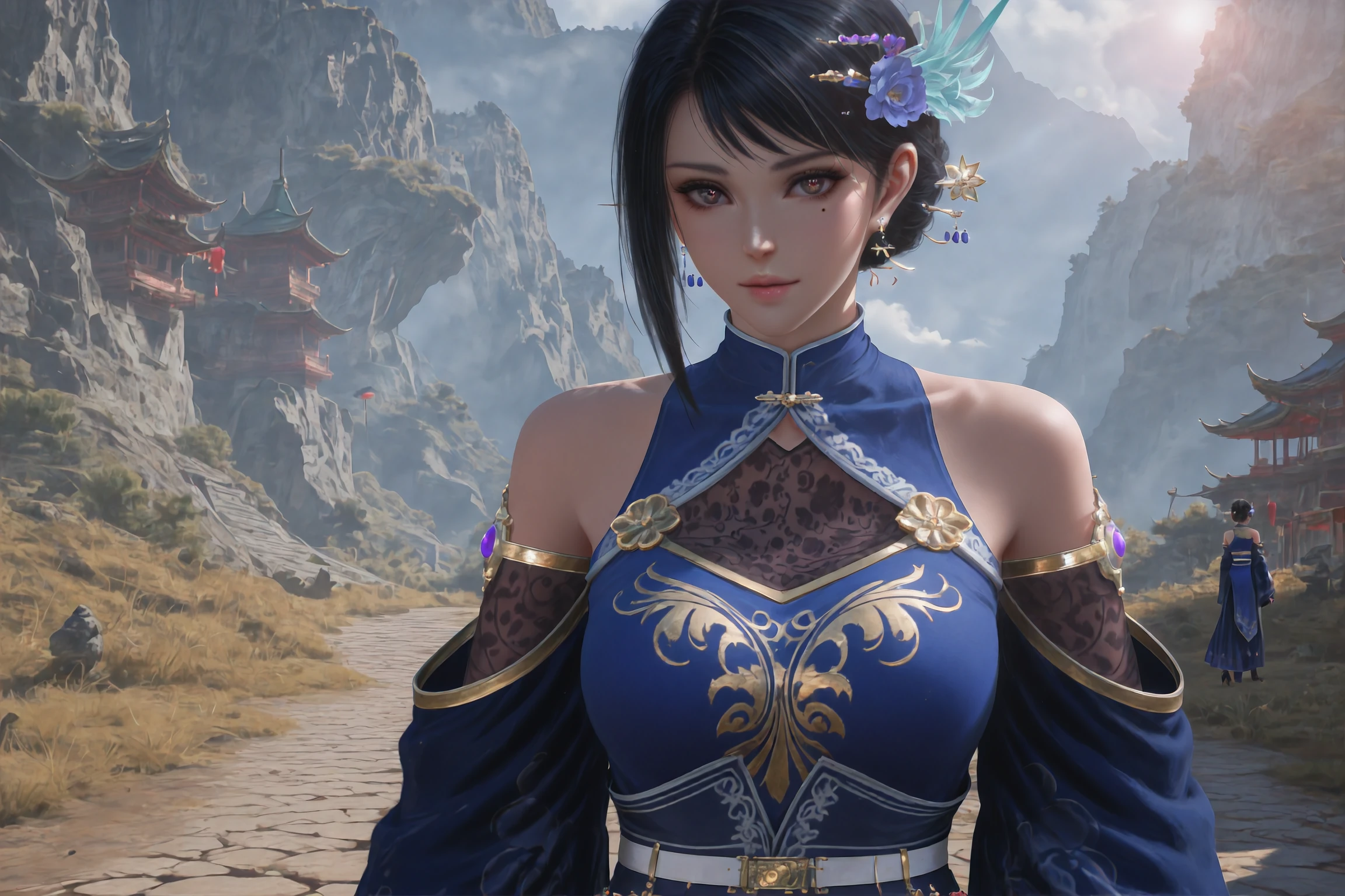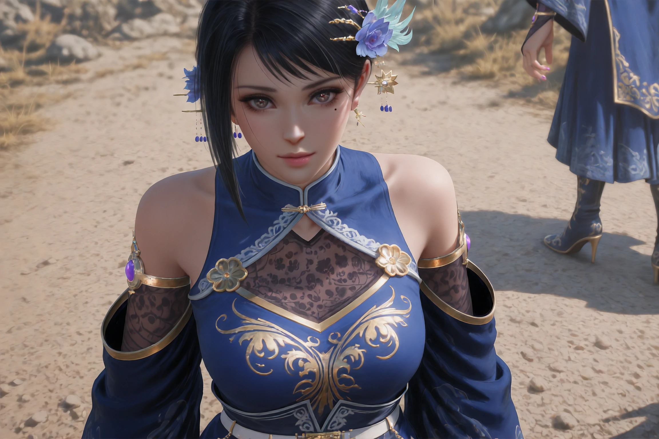 ZhenjiOrigin,asian,black hair,hair ornament,dress,earrings,detached sleeves,jewelry,blue dress,bare shoulders,bridal gauntlets,nail polish,high heel boots,wide sleeves,short hair,brown eyes,blue dress,mole under eye,hair flower,hair bun,belt,chinese clothes,