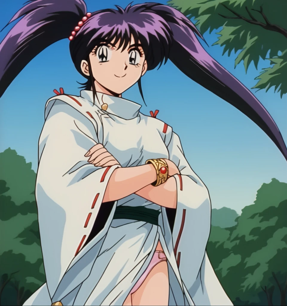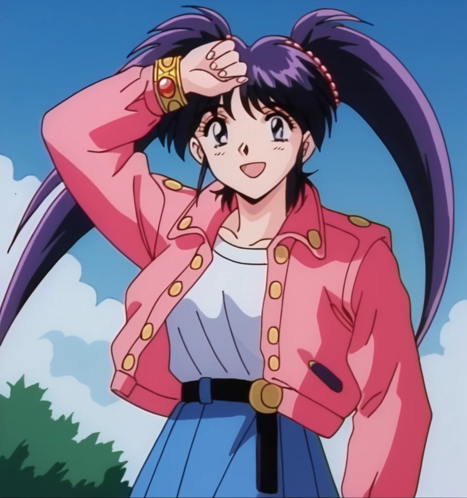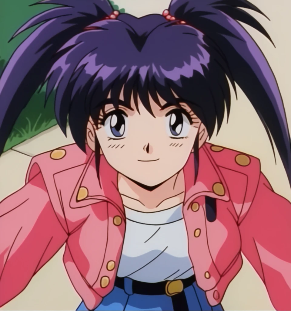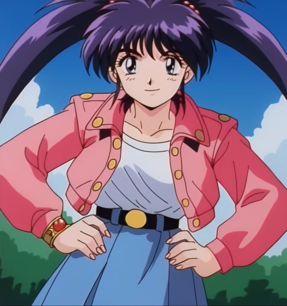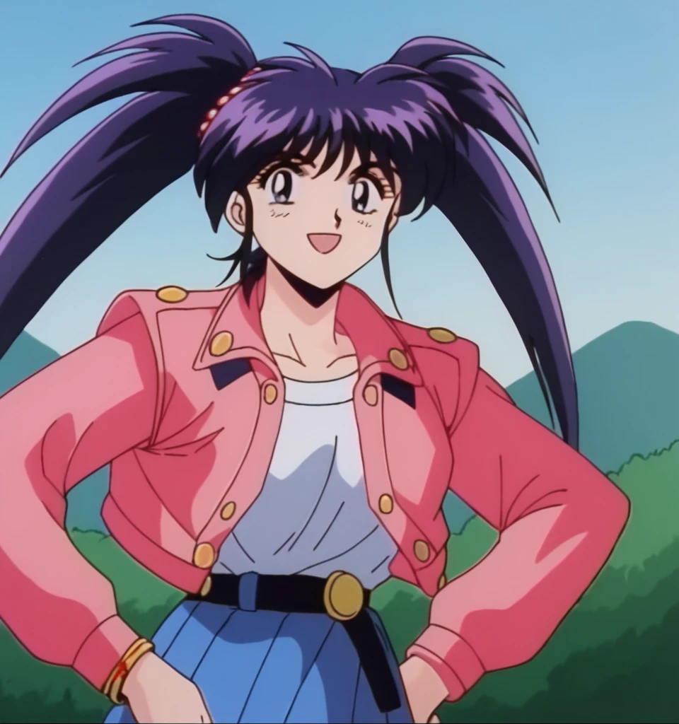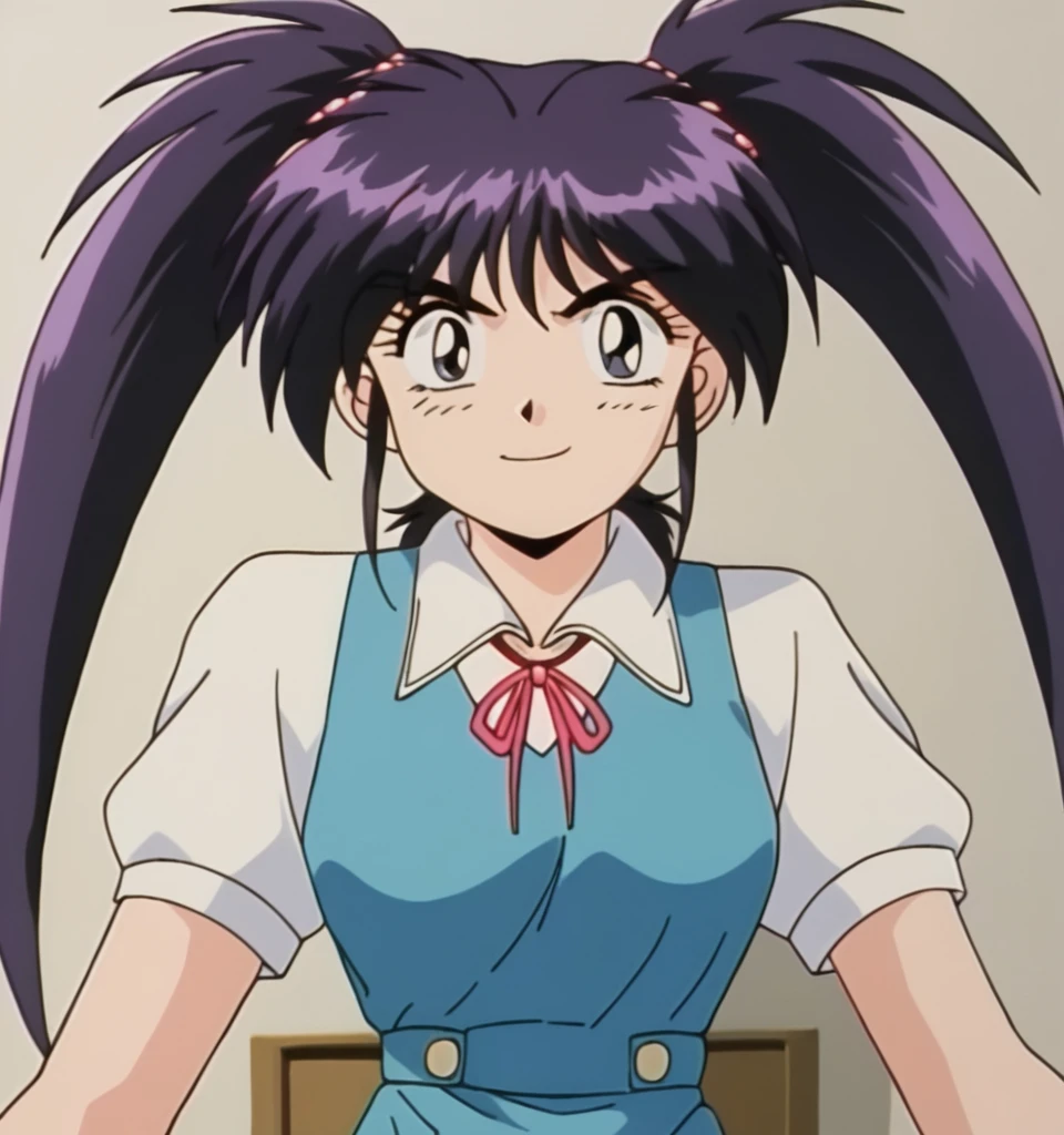 Chery , dark purple hair, bangs, twintails, long hair, dark blue eyes, medium breast, jewelry, gold bracelet, red pearls hair tie,