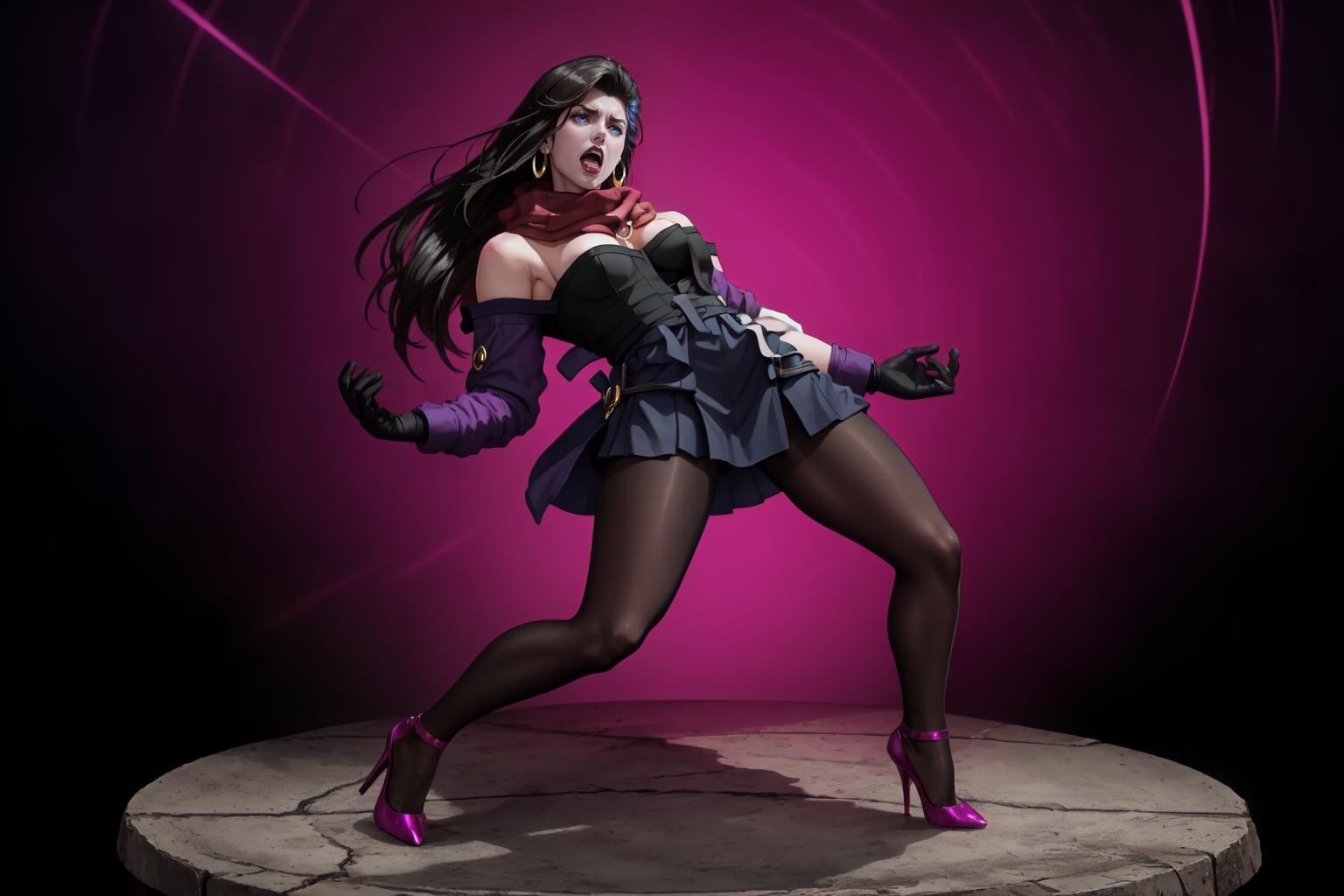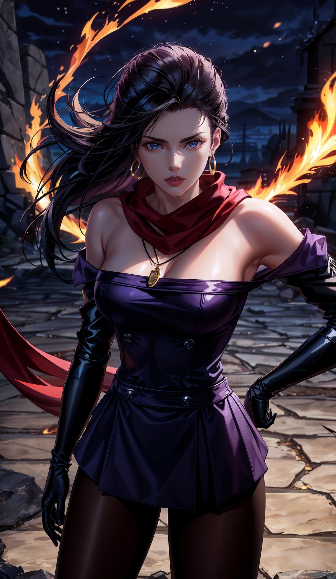 LisaLisa, mature female, milf, black hair, long hair, lipstick, makeup, earring, nailfingers (or purple gloves), blue|purple eyes