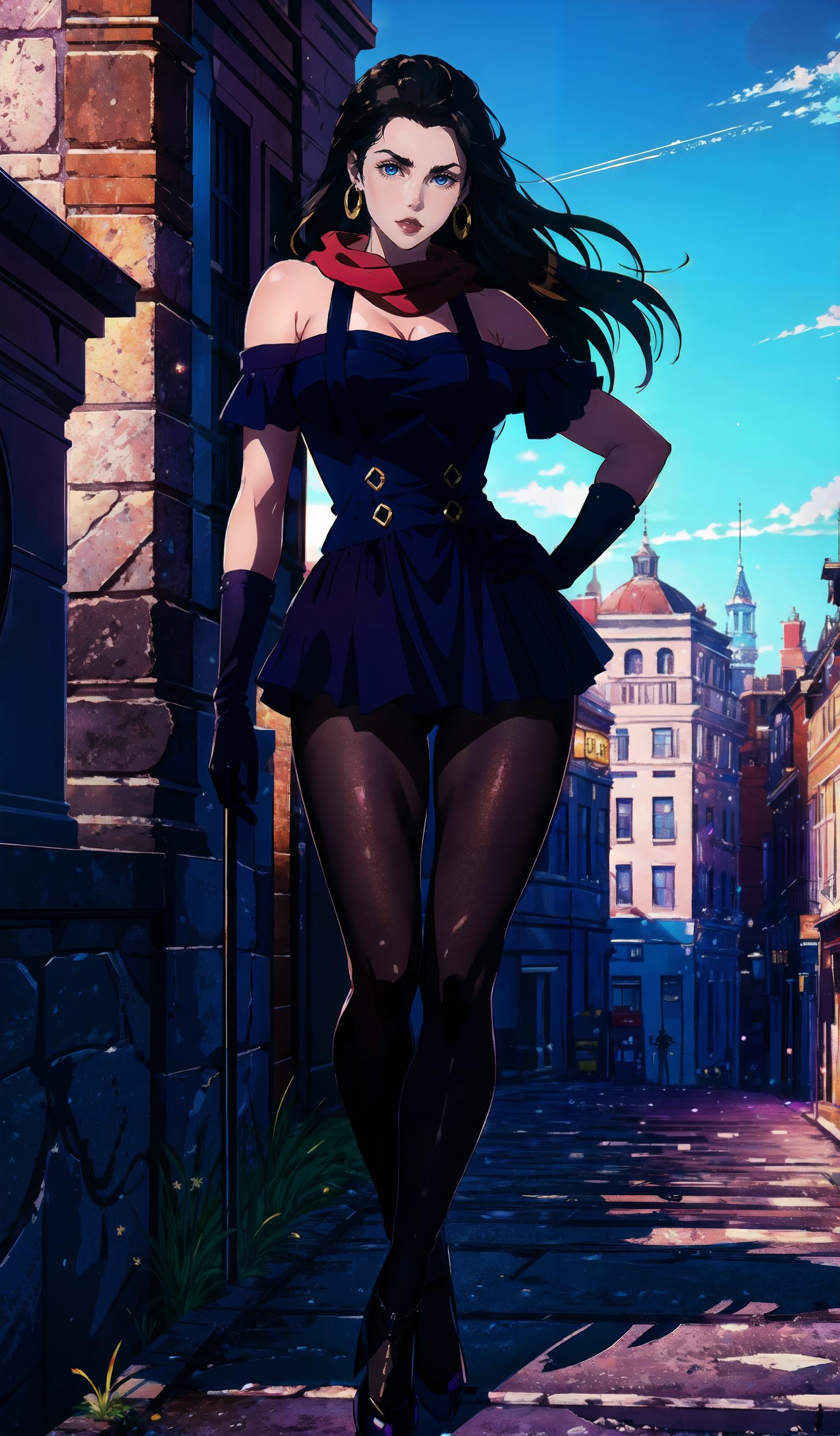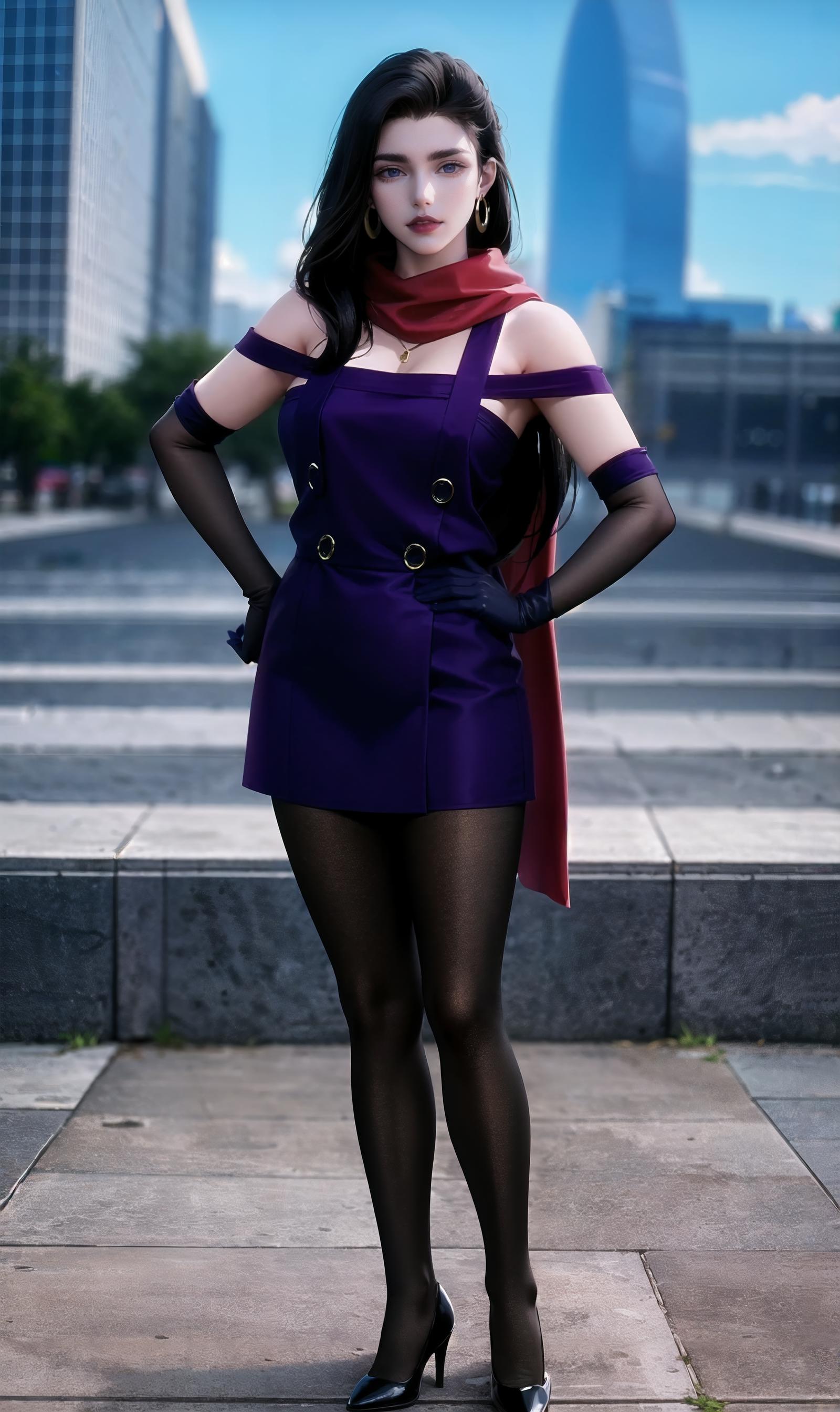 choker, black pantyhose, higheels, scarf, red scarf, off-shoulder, dress, (or off-shoulder dress), miniskirt, bare shoulders, necklace, purple gloves, elbow gloves, earring, jewelry
