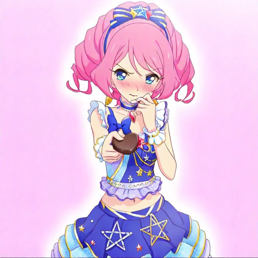 laura sakuraba \(aikatsu\), pink hair, medium hair, side drill hair, bangs, sidelocks, blue eyes, headdress, hairbow, choker, bow, gem, wrist cuffs, dress, navel, midriff, skirt, straps, idol outfit, heels, large breasts, 1girl, solo