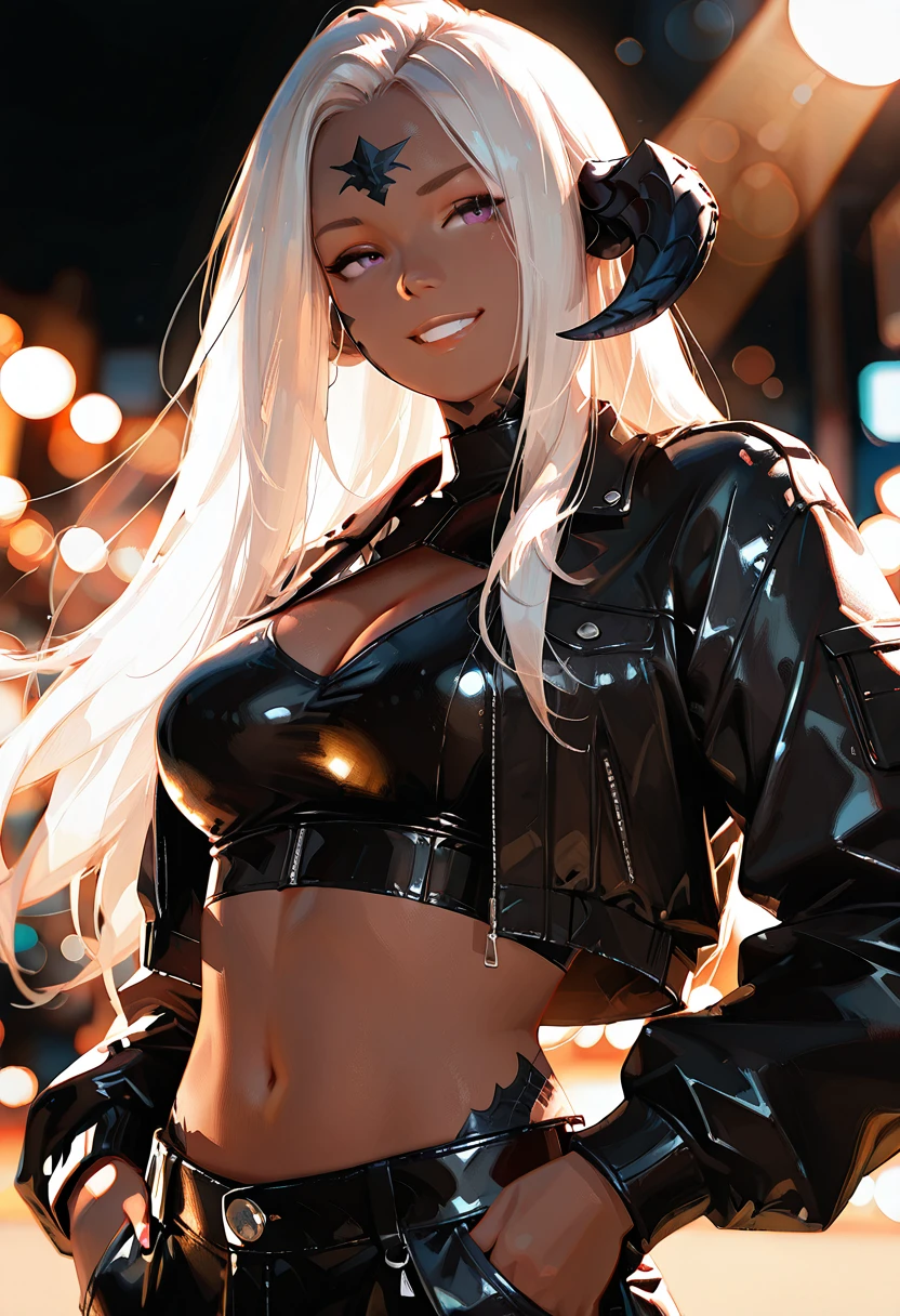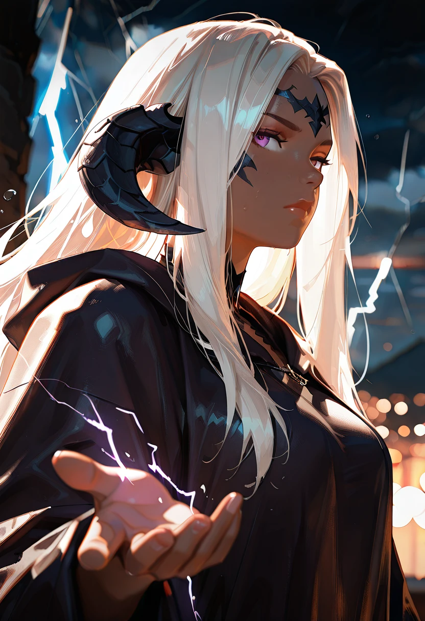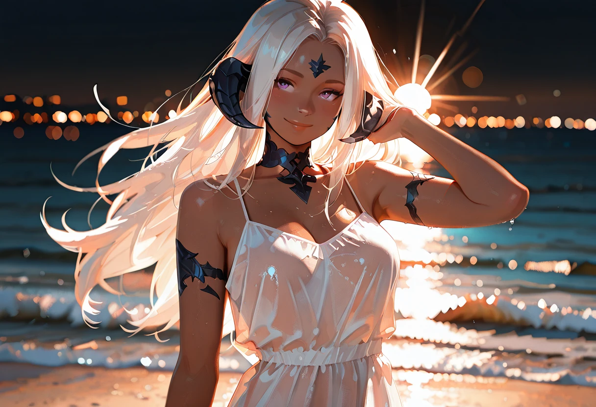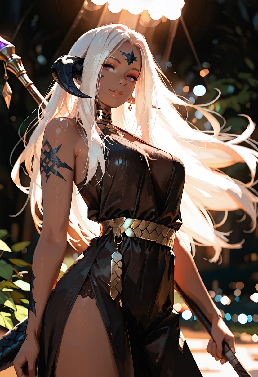 Zhareya is a proud Xaela Au Ra with deep onyx scales and sun-kissed dark skin that glows like polished bronze under candlelight. Her impossibly long white hair flows like moonlit silk, and her amethyst eyes carry the quiet confidence of a woman who knows exactly the effect she has on others.