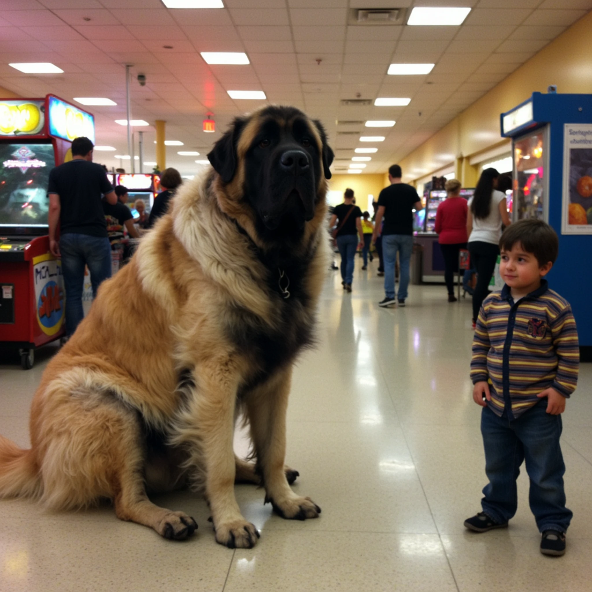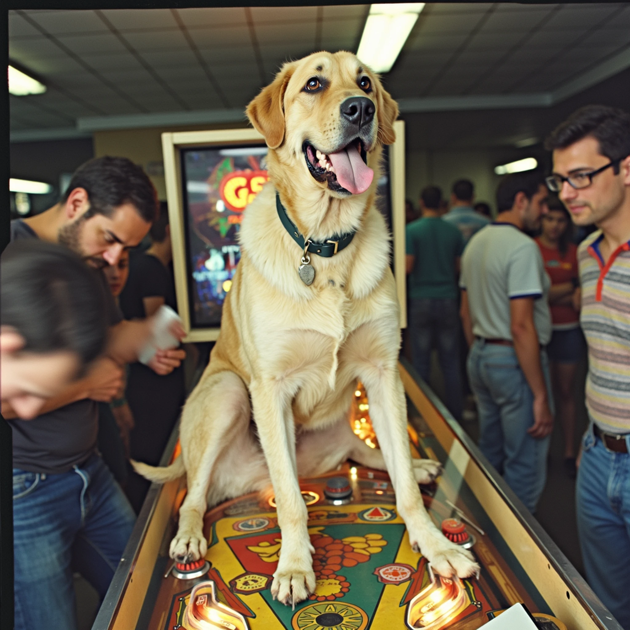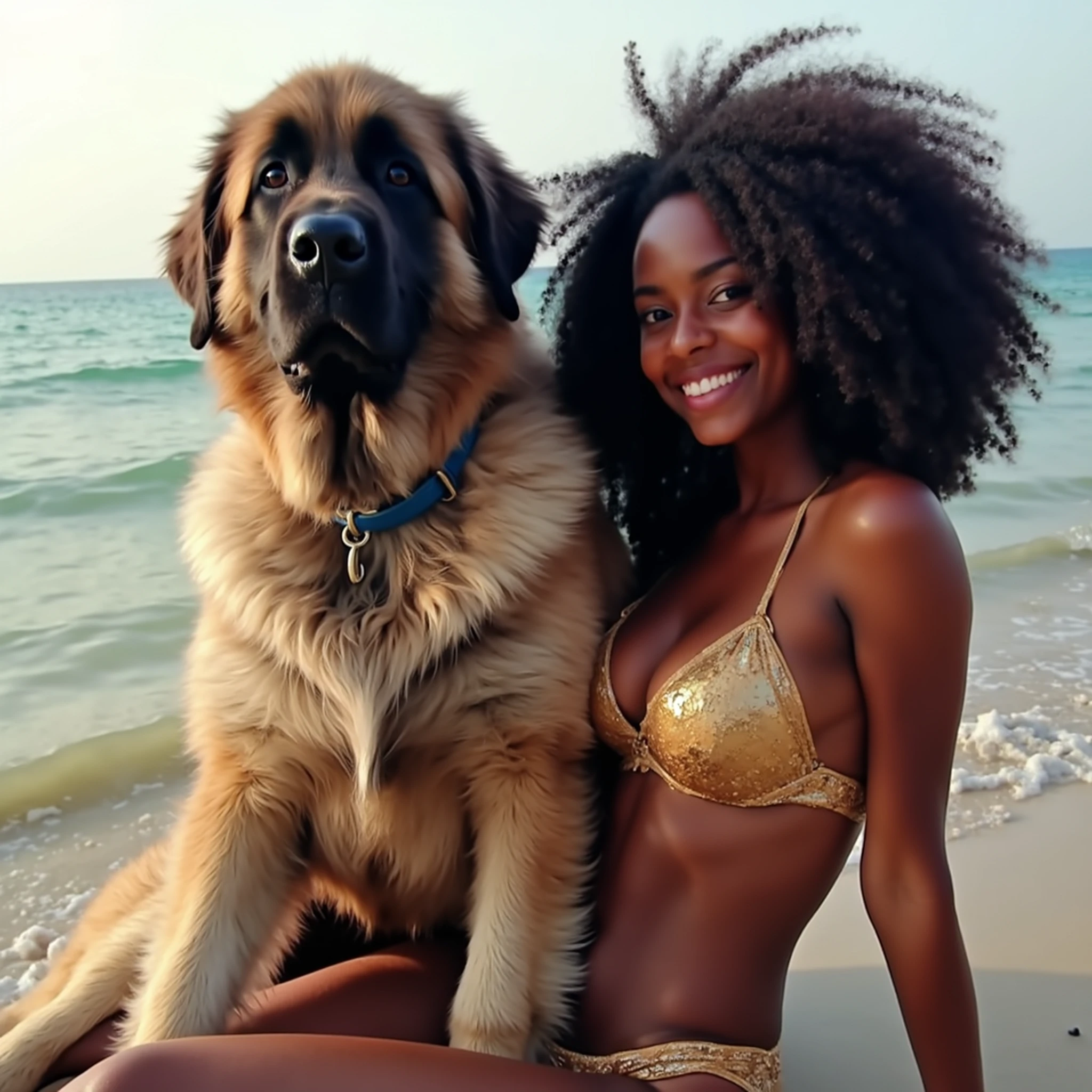 One could also try "b1gd0g a giant dog sitting on the lap of a beautiful black woman wearing a gold bikini, the woman has an afro." if one wanted to.