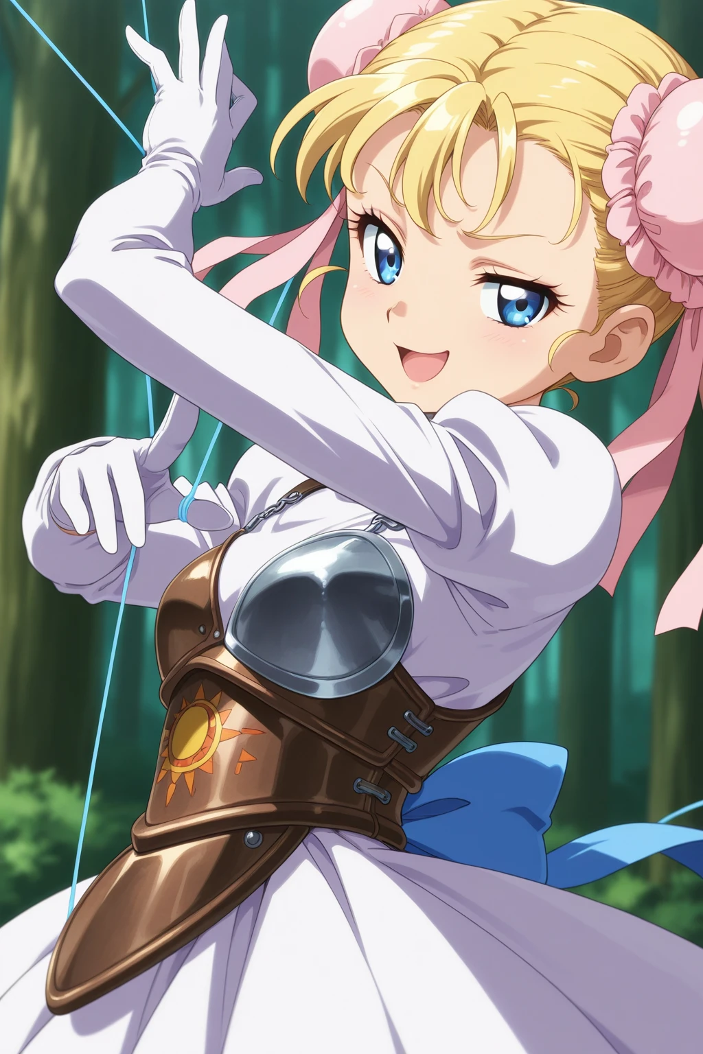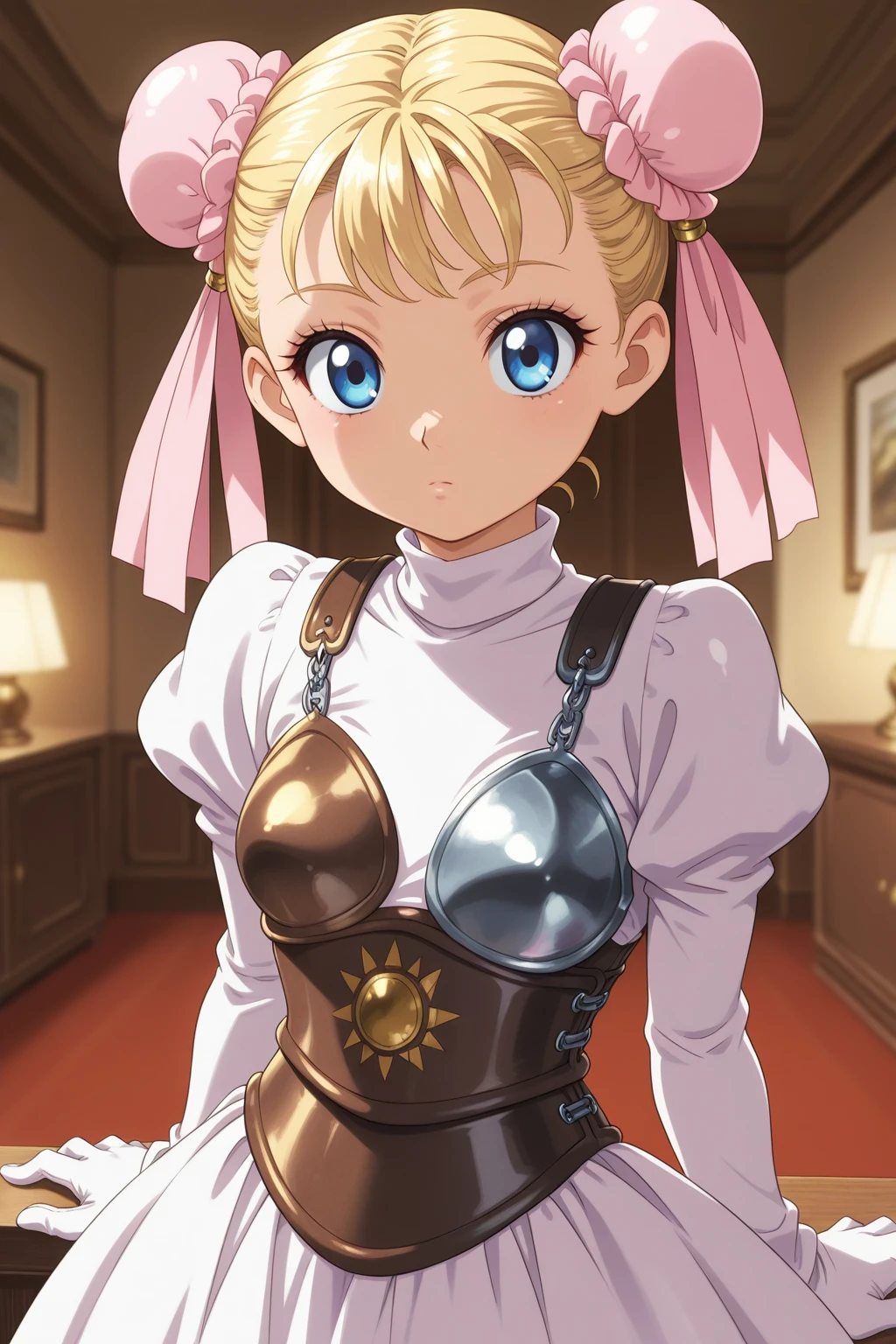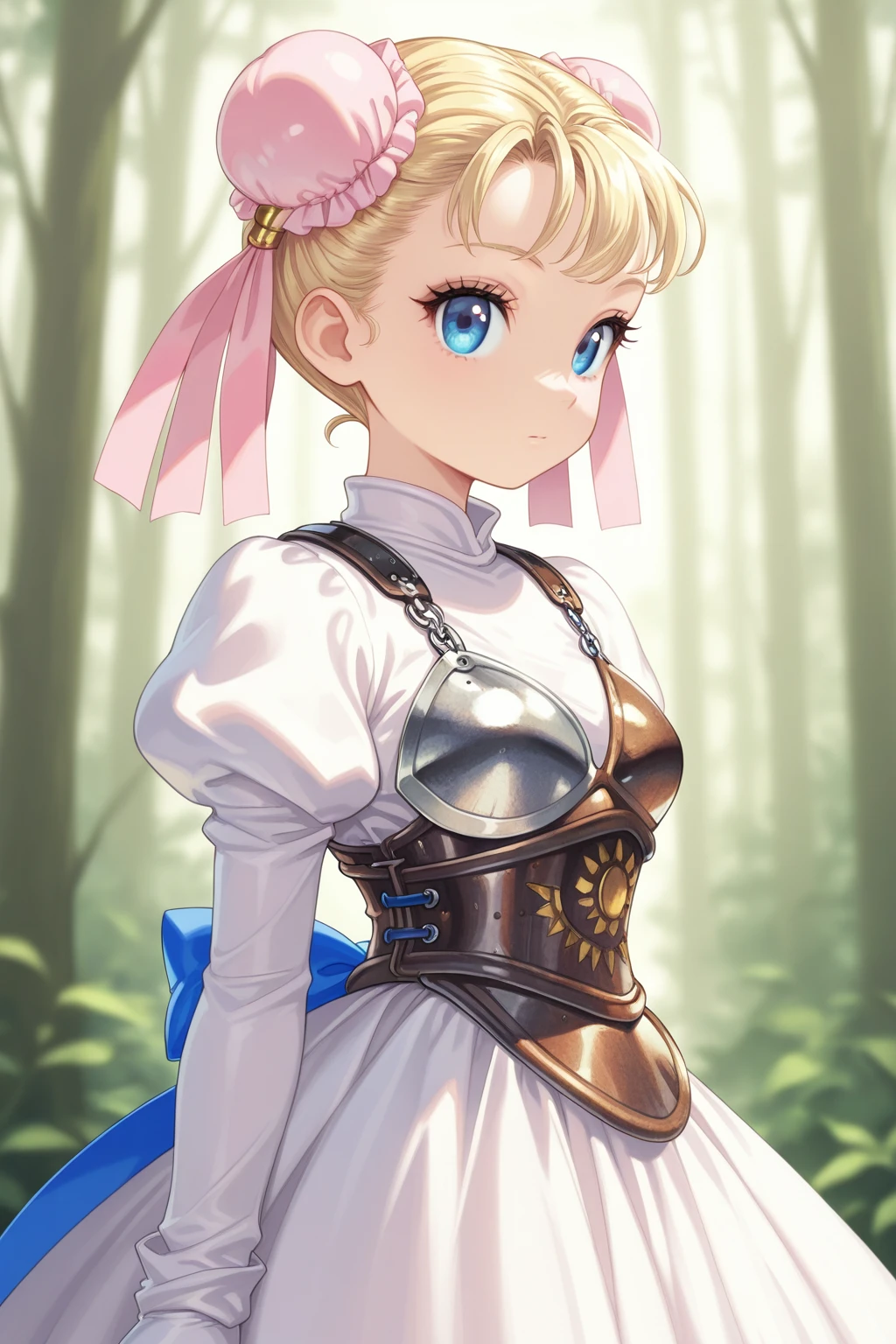 MRCC, short hair, blonde hair, double bun, blue eyes, eyelashes, small , bun cover, pink ribbon, turtleneck, white dress, puffy long sleeves, white gloves, brown armor, boobplate, brown corset, blue bow, brown footwear