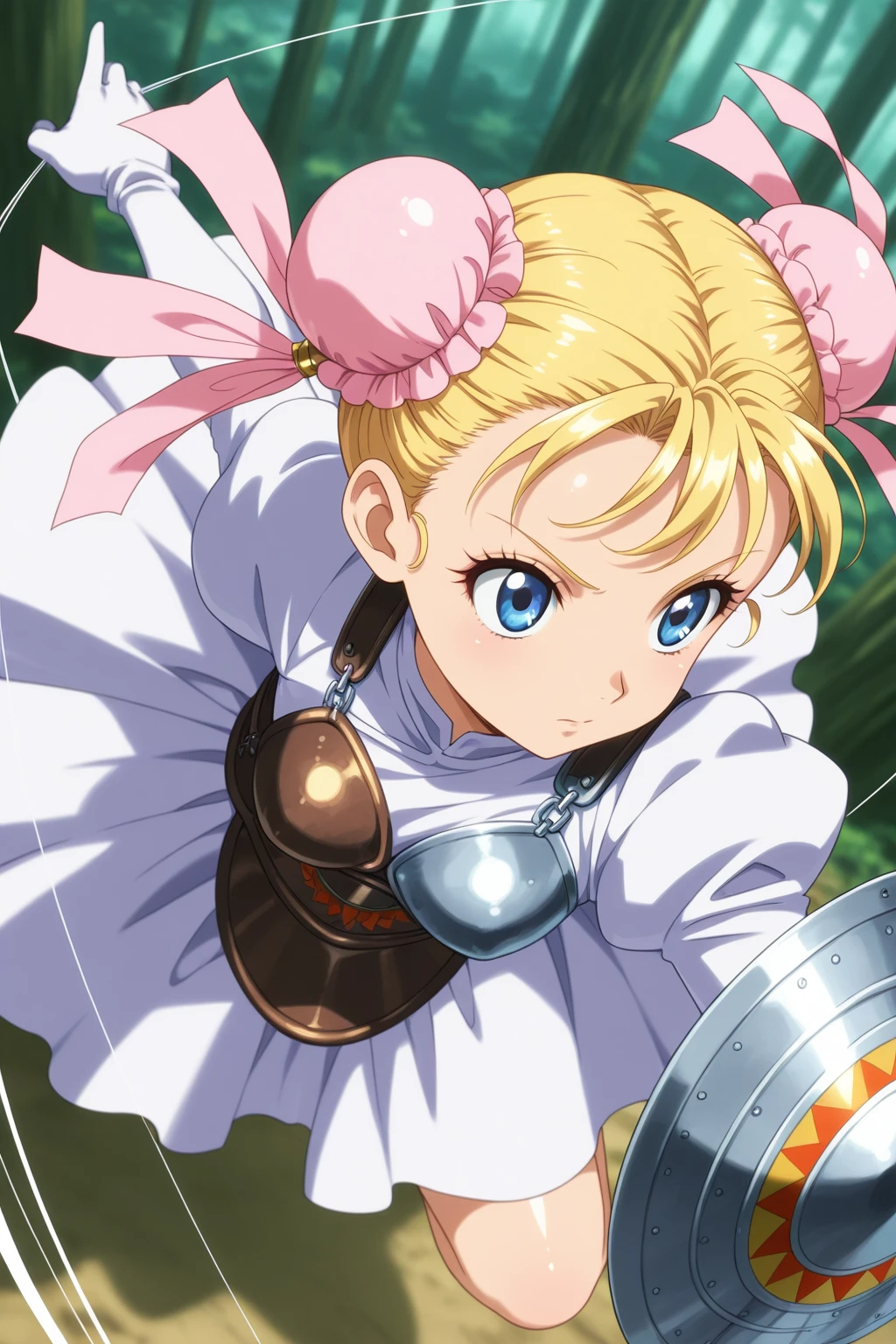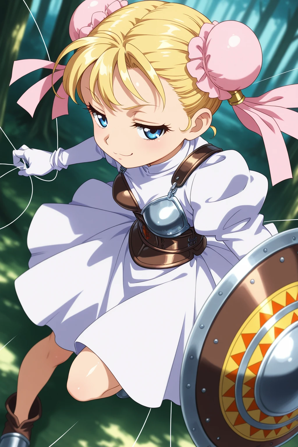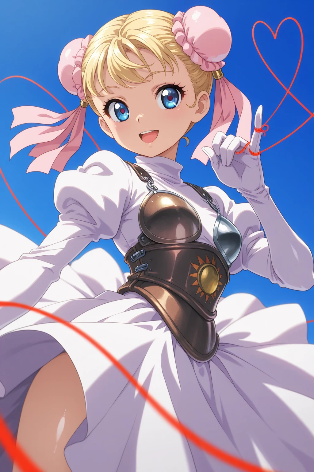 MRCC, short hair, blonde hair, double bun, blue eyes, eyelashes, small , bun cover, pink ribbon, turtleneck, white dress, puffy long sleeves, white gloves, brown armor, boobplate, brown corset, blue bow, brown footwear