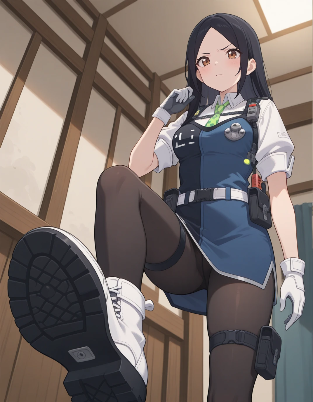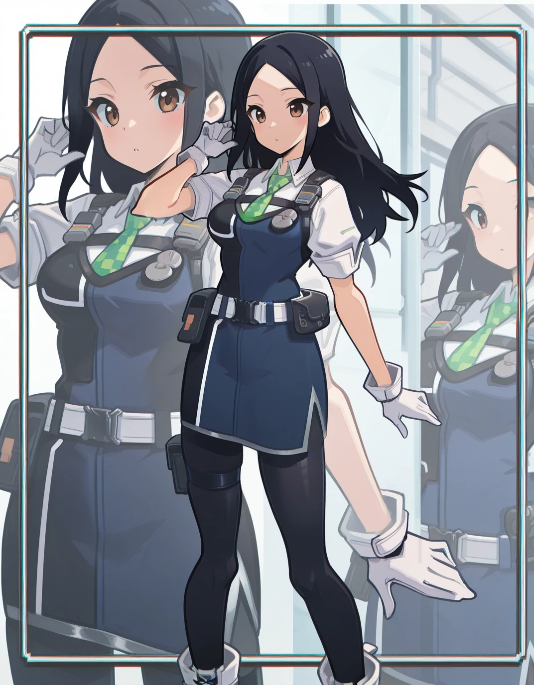 AESita, brown eyes, black hair, long hair, parted bangs, blue dress, green necktie, collared shirt, short sleeves, white shirt, white gloves, holster, walkie-talkie, belt, black pantyhose, thigh strap, cross-laced footwear, white footwear,