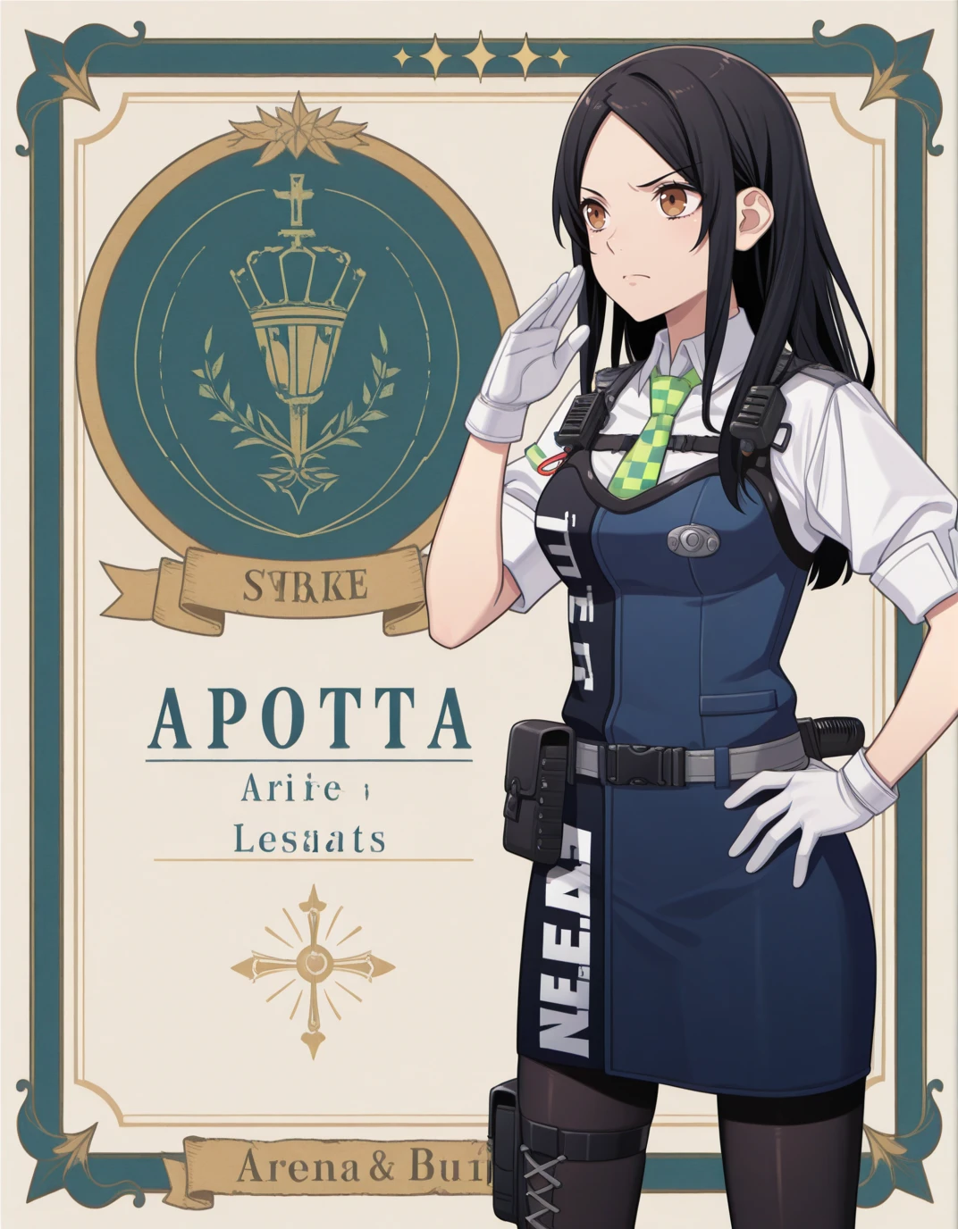 blue dress, green necktie, collared shirt, short sleeves, white shirt, white gloves, holster, walkie-talkie, belt, black pantyhose, thigh strap, cross-laced footwear, white footwear,Hope you like it!