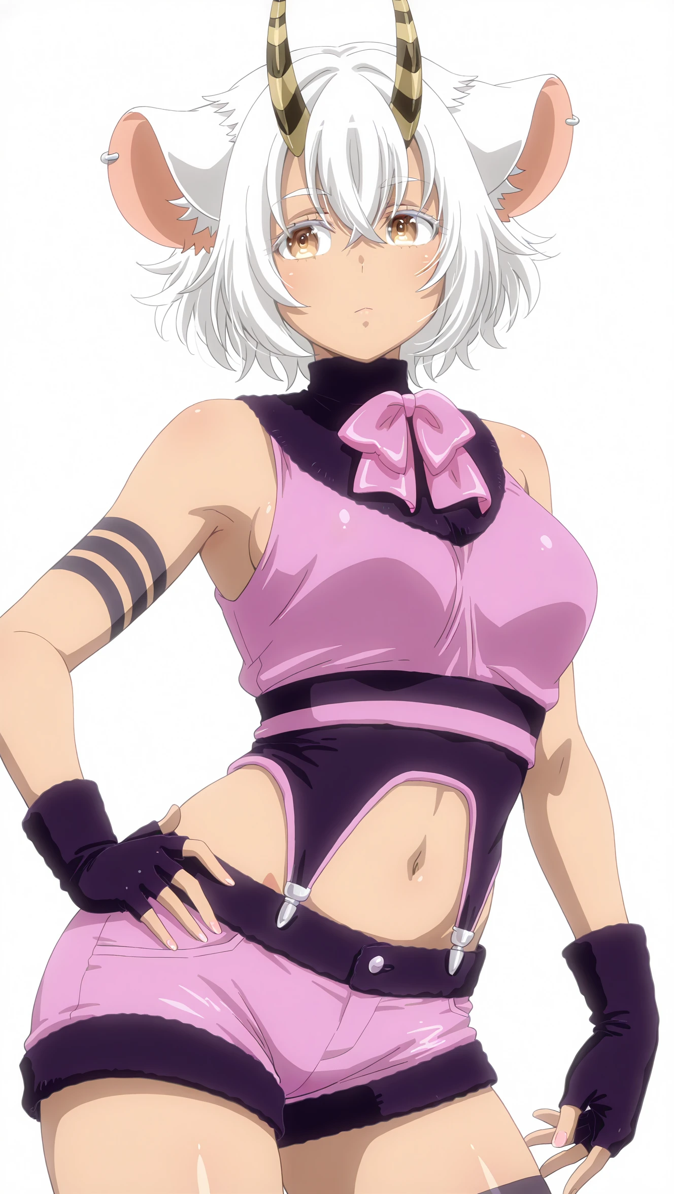 belphegor, 1girl, dark skin, dark-skinned female, short hair, white hair, hair between eyes, brown eyes, mouse ears, antelope horns, medium breasts, high neck pink top, midriff, shorts, bare shoulders, pink bow, bowtie, pink top, fingerless gloves, gloves, solo, pose, standing, looking at viewer, white background, simple background, masterpiece, best quality, amazing quality, intricate ditails, uncensoredDescription