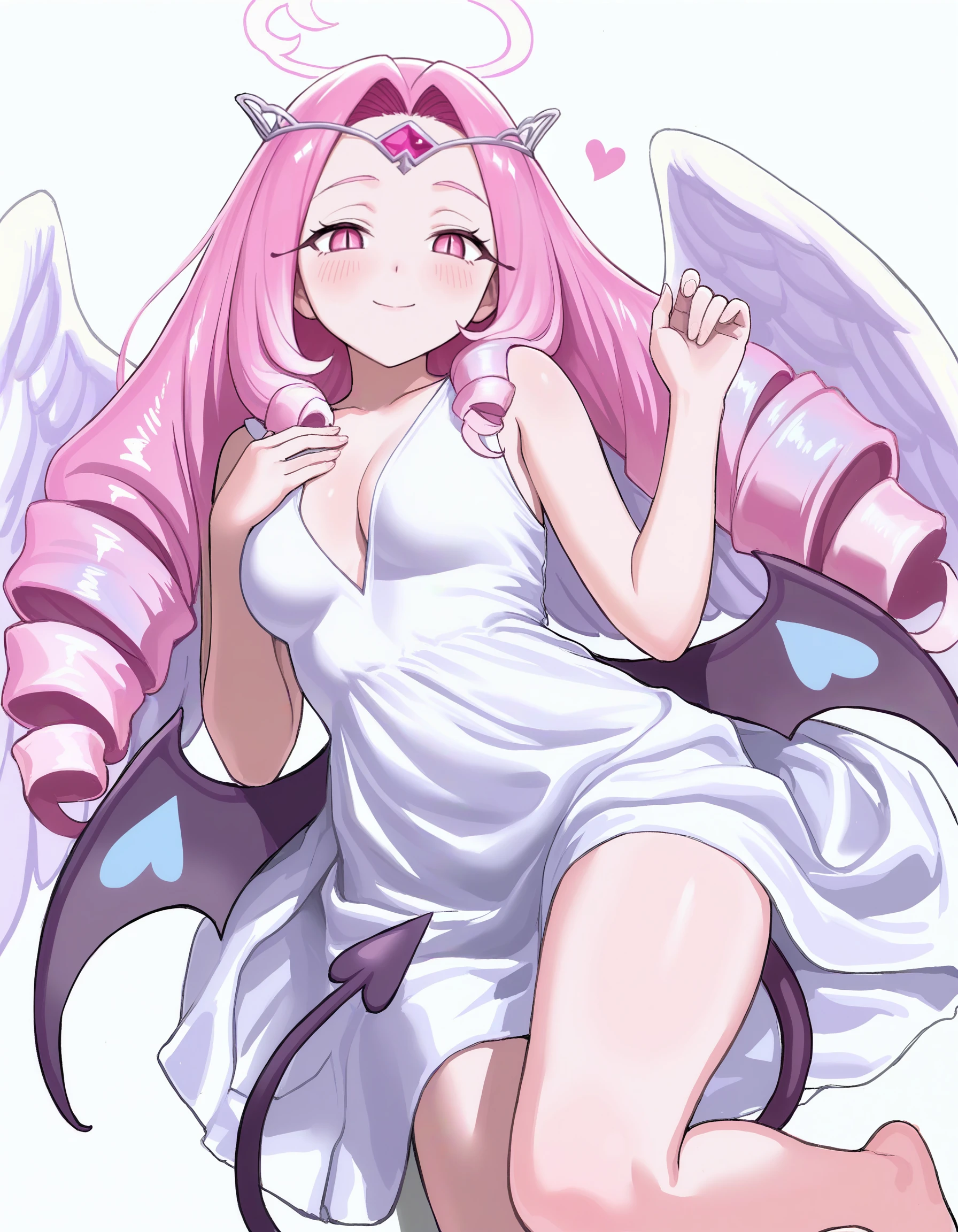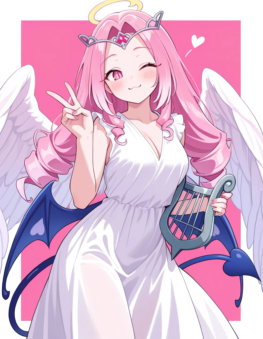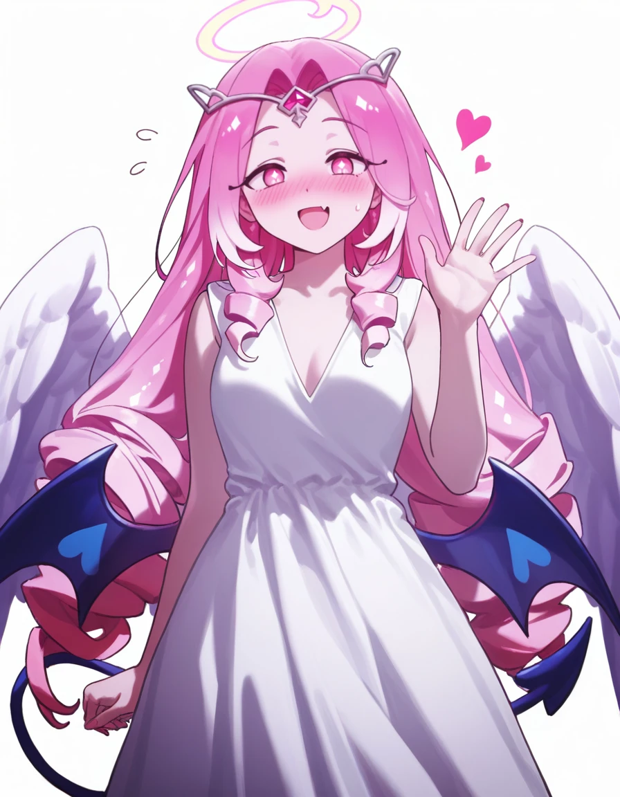 1girl, pink hair, gradient hair, tiara, halo, parted hair, white dress, slit pupils, tail, sleeveless, drill hair, v neck, medium breasts, medium dress, pink eyes, heart wings, light blue demon wings, angel wings,