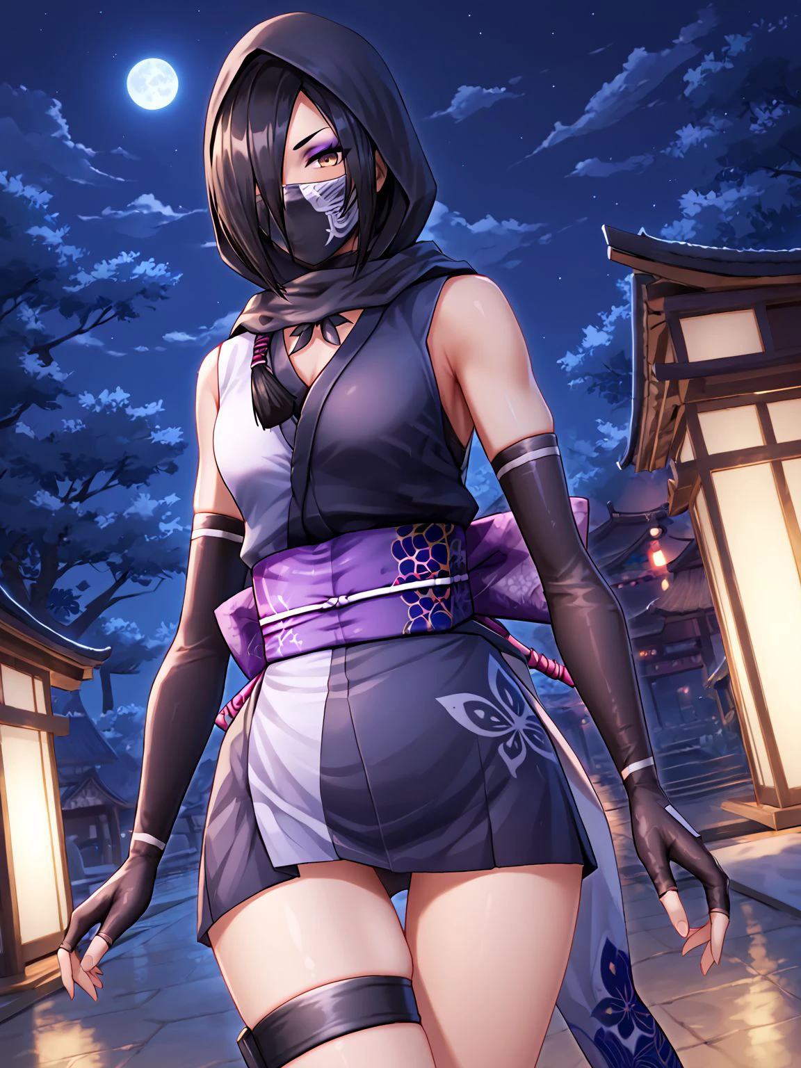 ninja,black hair,brown eyes,hair over one eye,eyeshadow,purple eyeshadow,breasts,small breasts,bare shoulders,mask,mouth mask,covered mouth,ninja mask,japanese clothes,kimono,short kimono,obi,elbow gloves,fingerless gloves,gloves,hood,skirt,sandals,socks,black legwear,toes,thigh strap,
